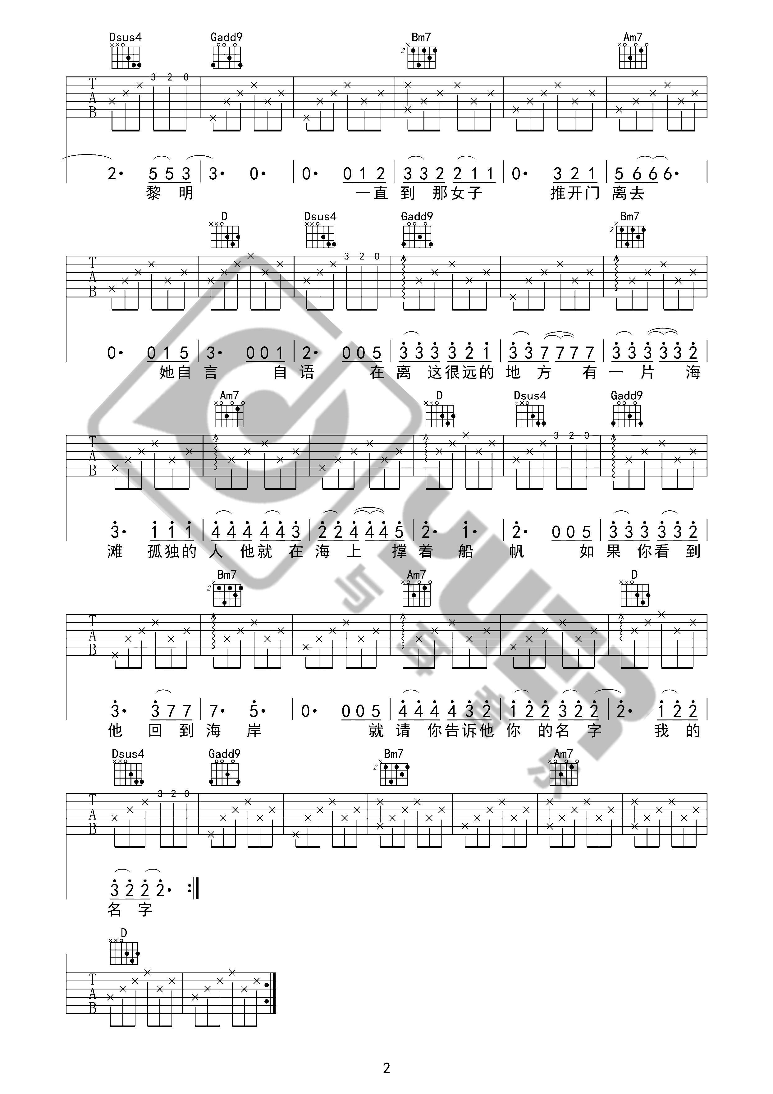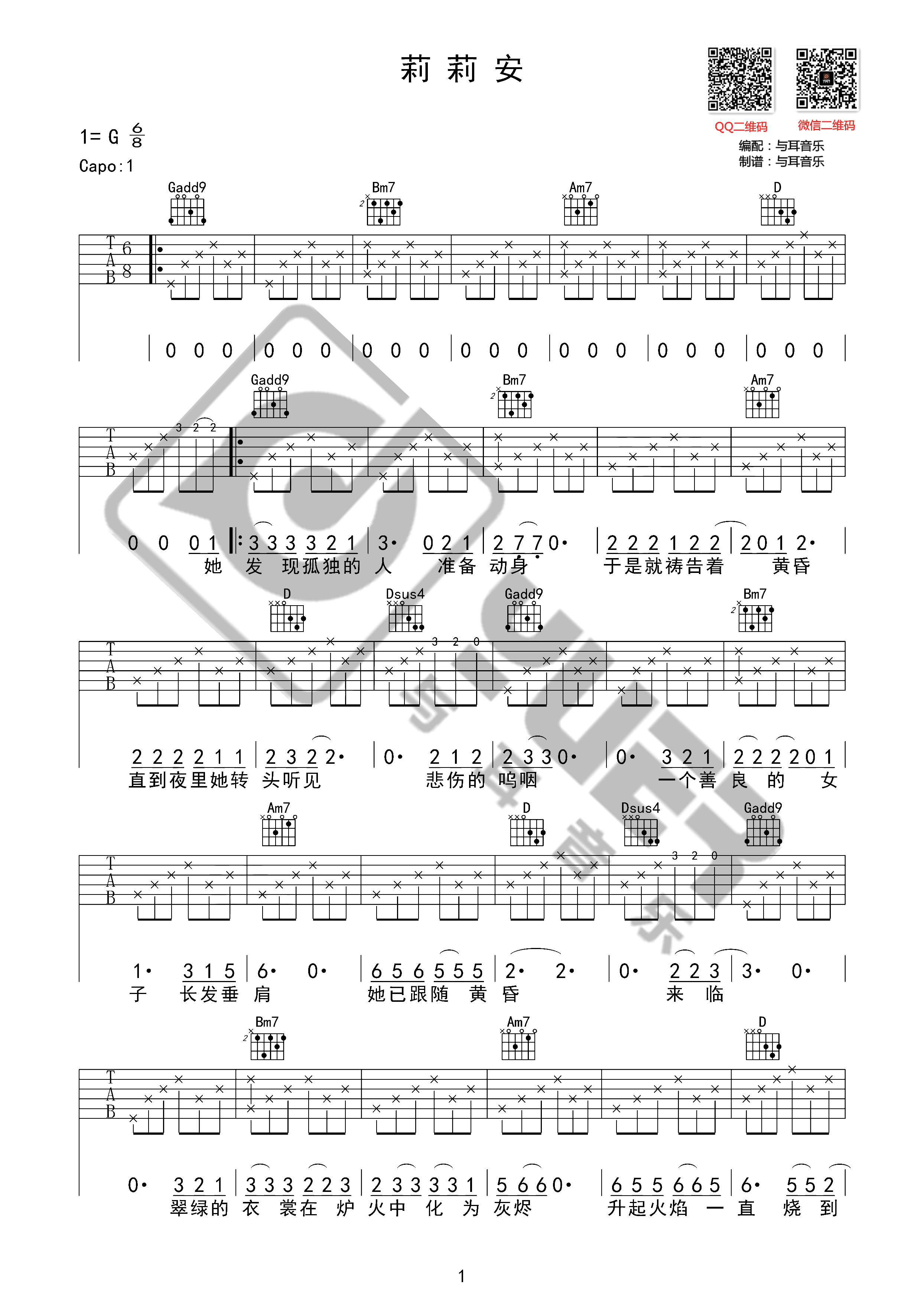 曲谱介绍: 宋冬野《莉莉安》吉他弹唱谱,共有2张高清图谱,免翻页排版设计。
