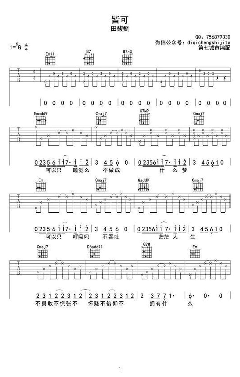 曲谱介绍: 《皆可》吉他谱,田馥甄的一首新歌,唱出面对人生的一种一切皆可的从容坦然态度。皆可六线谱,三张弹唱图片谱,感谢第七城市编配,上传分享。