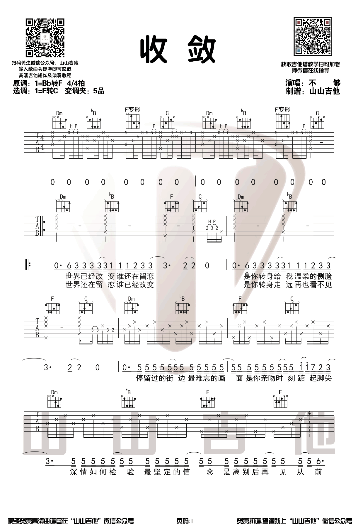 曲谱介绍: 不够《收敛》吉他谱,选用F调转C调的和弦编配,变调夹夹五品。编有原版的前奏和间奏,适合进阶琴友练习,收敛六线谱,三张弹唱图片谱。山山吉他编配出品,整理上传。 最近抖音上这首新歌火了,面对喜欢的人,却只懂得收敛自己不敢表达自己,收敛自己内心,但是对于你的爱我发现无法收敛,因为这是爱。