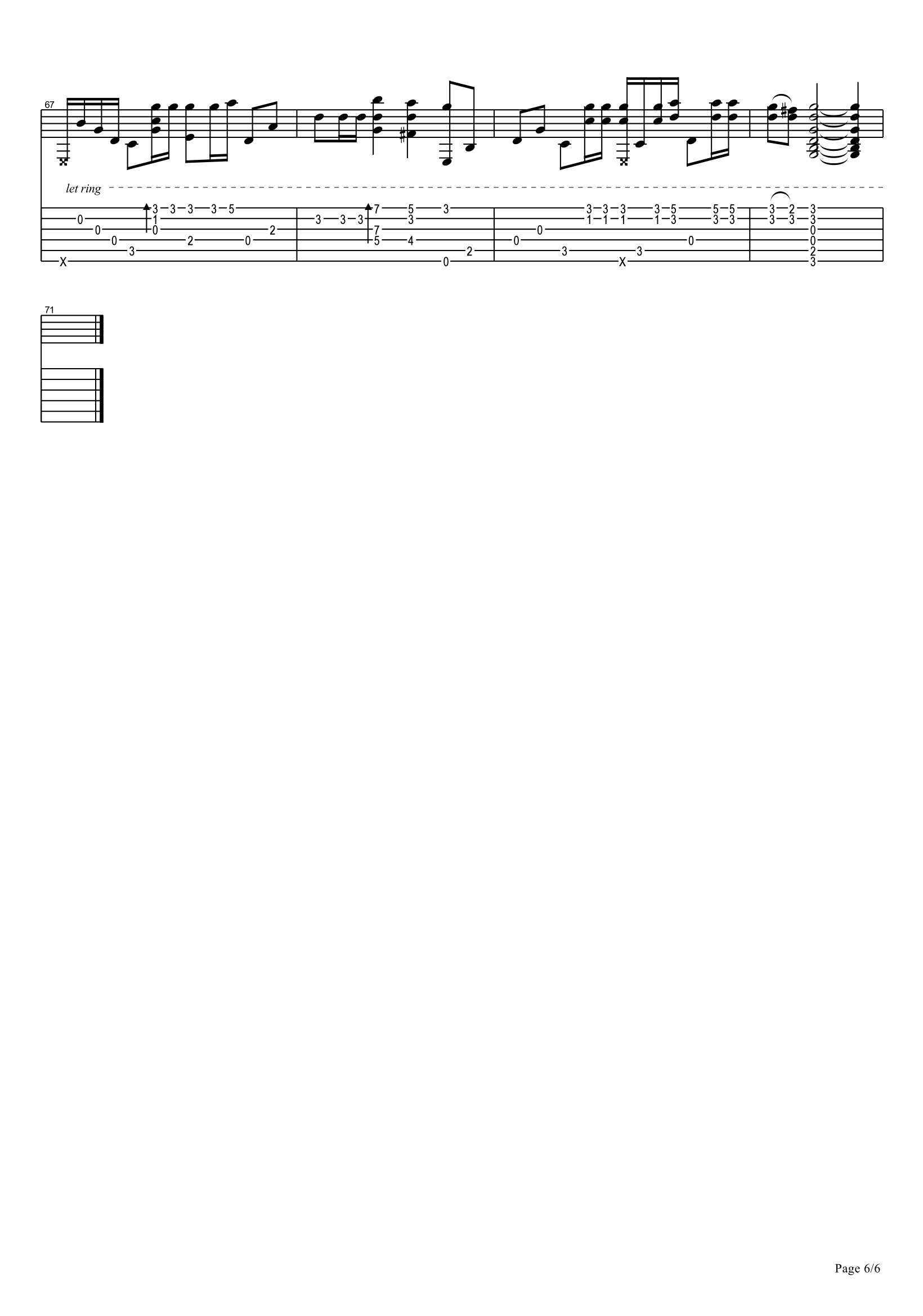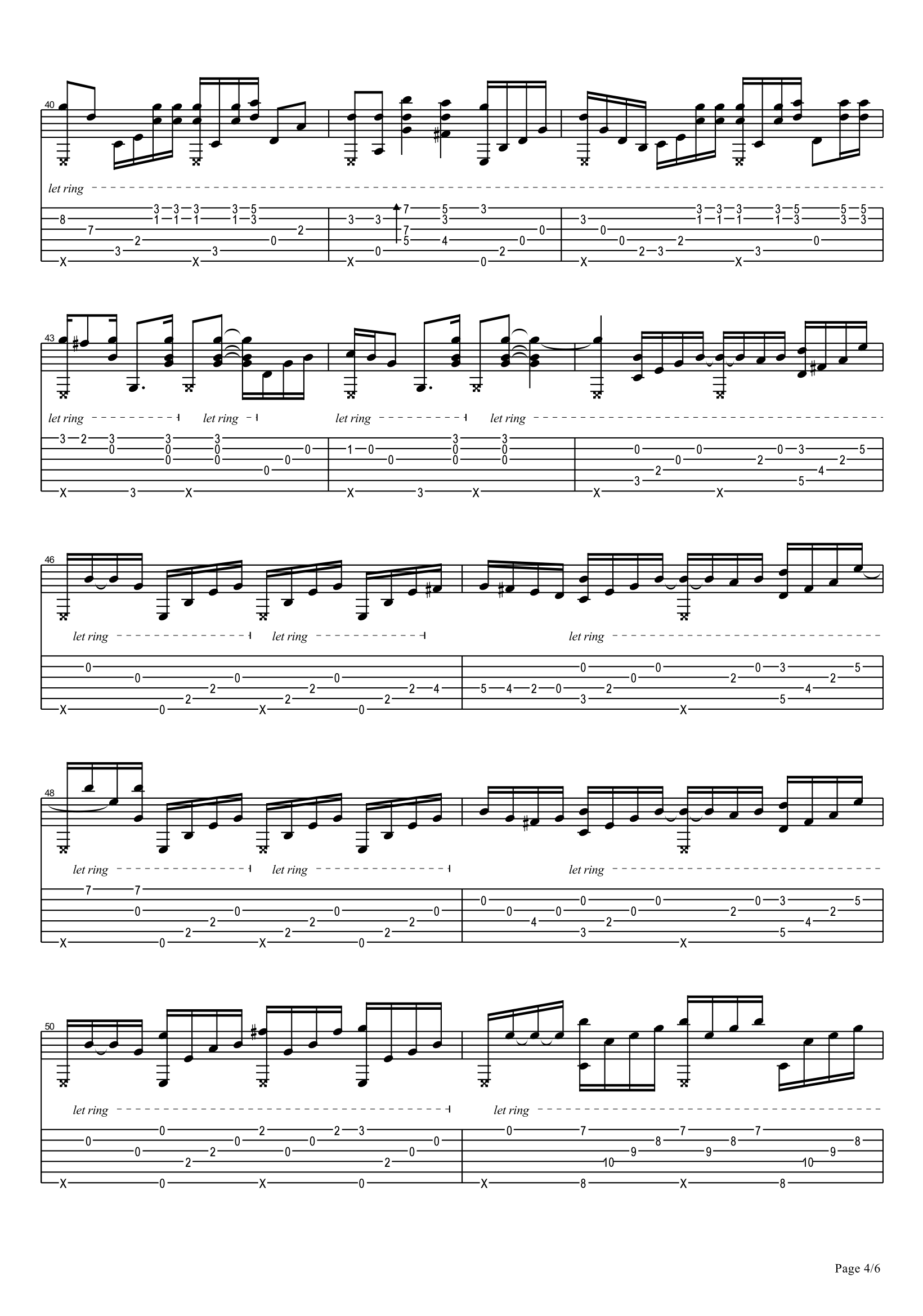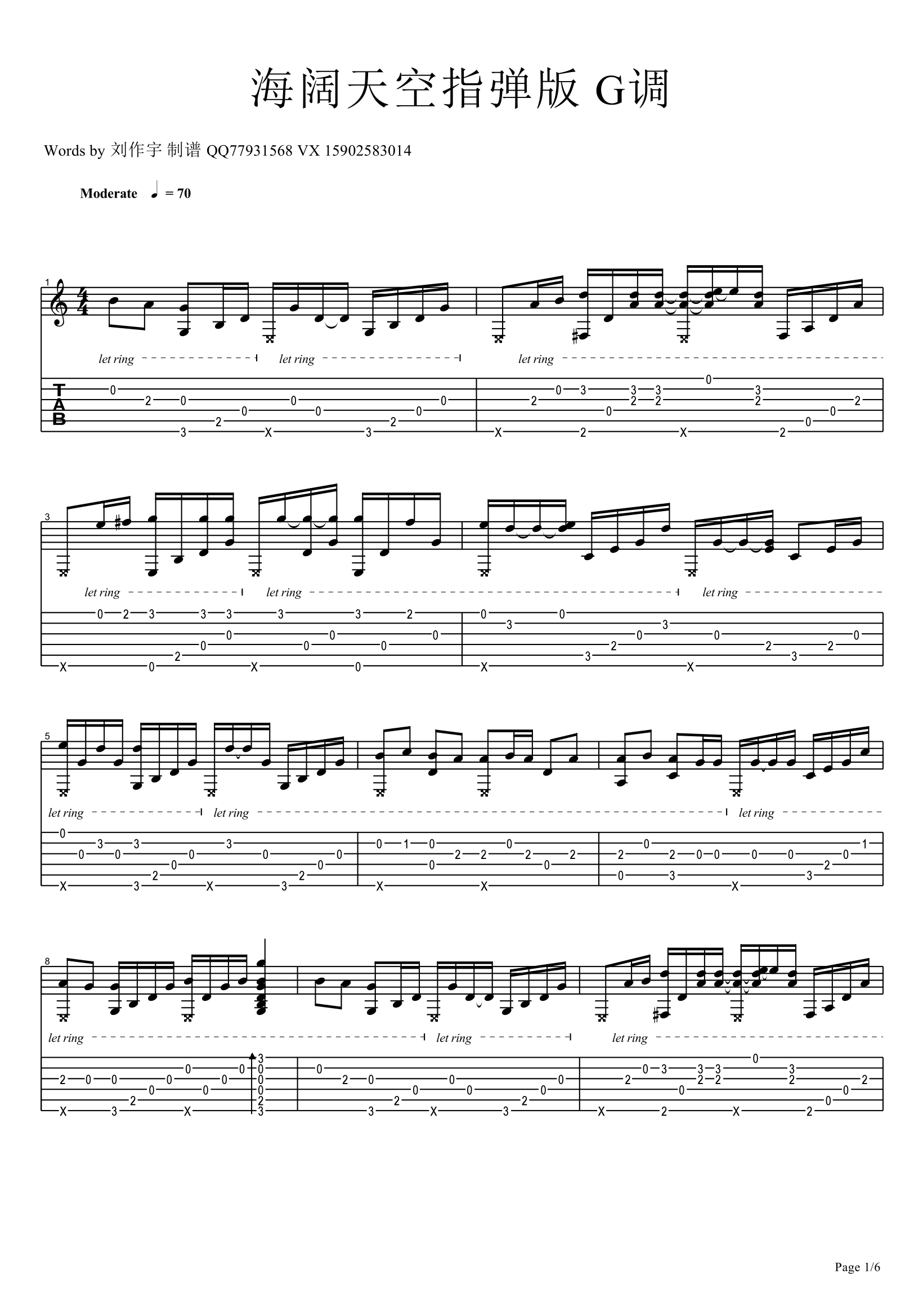 曲谱介绍: 海阔天空吉他指弹谱,Beyond的经典代表歌曲改编,歌里蕴藏着家驹对人生的感悟,对自由的渴望,以及对理想的追求。海阔天空吉他独奏谱,G调编配,完整版共六张高清图片谱,感谢刘作宇制谱出品,为琴友们上传。 不敢说它是黄家驹的巅峰之作,但就他的音乐生涯来看,这首歌无疑是最杰出的作品。这首歌大气磅礴,积极向上,充满斗志。其感情色彩虽显得悲壮但又不失气节,意境苍凉却又透出几许不羁。它的旋律慷慨激昂,层次丰富,触碰着每一位听者的神经。