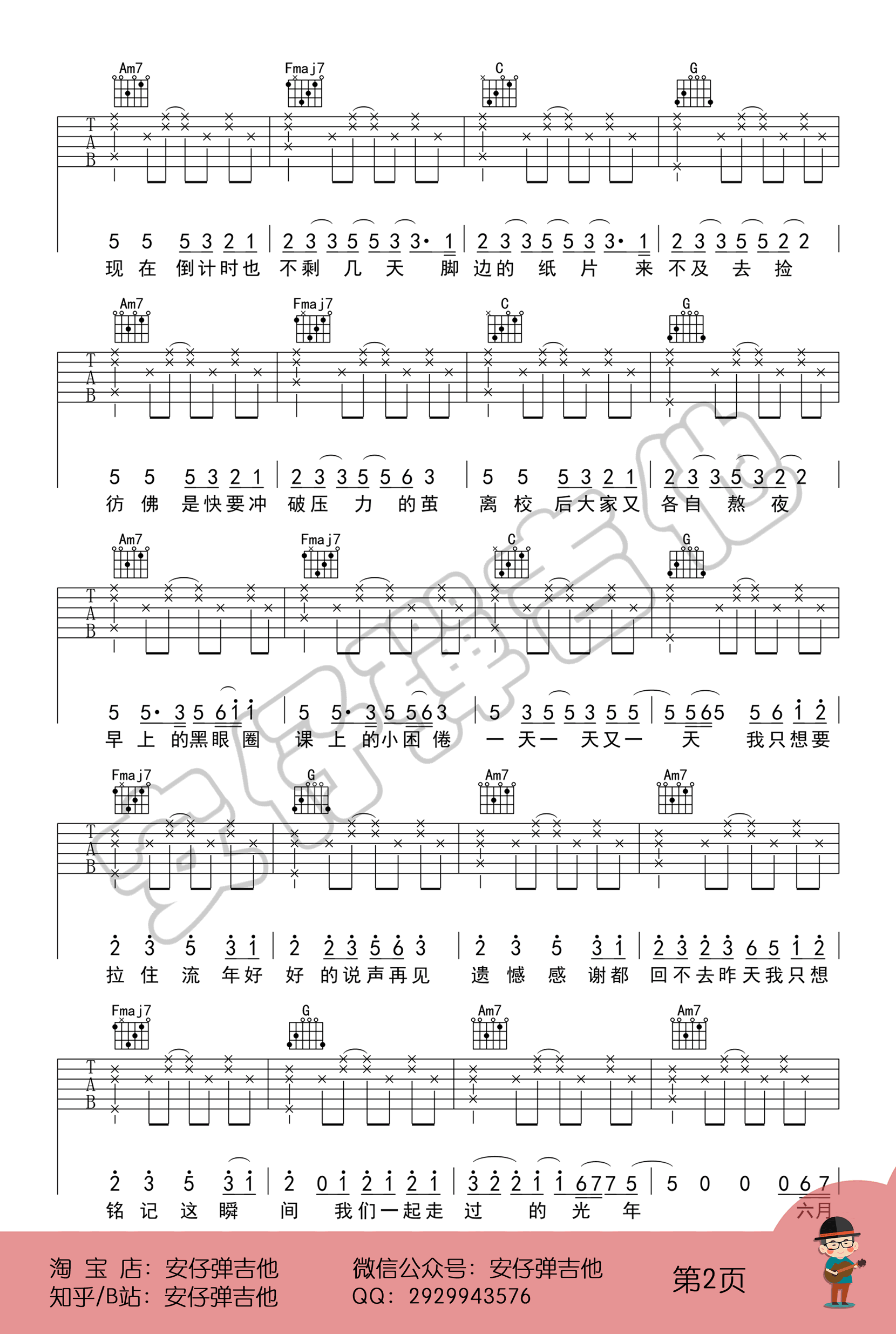 曲谱介绍: 《纪念》吉他谱,雷雨心一首怀念校园生活的歌。记念六线谱,原调F,选用C调指法,变调夹夹五品。完整版共五张高清图片谱,安仔弹吉他编配出品,整理上传。 和声分析 主歌和声进行:6415,6415能举出的相似歌曲太多了,朴树《平凡之路》郑钧《低空飞行》,副歌和声进行:456 456 451,类似歌曲华晨宇《好想爱这个世界啊》。