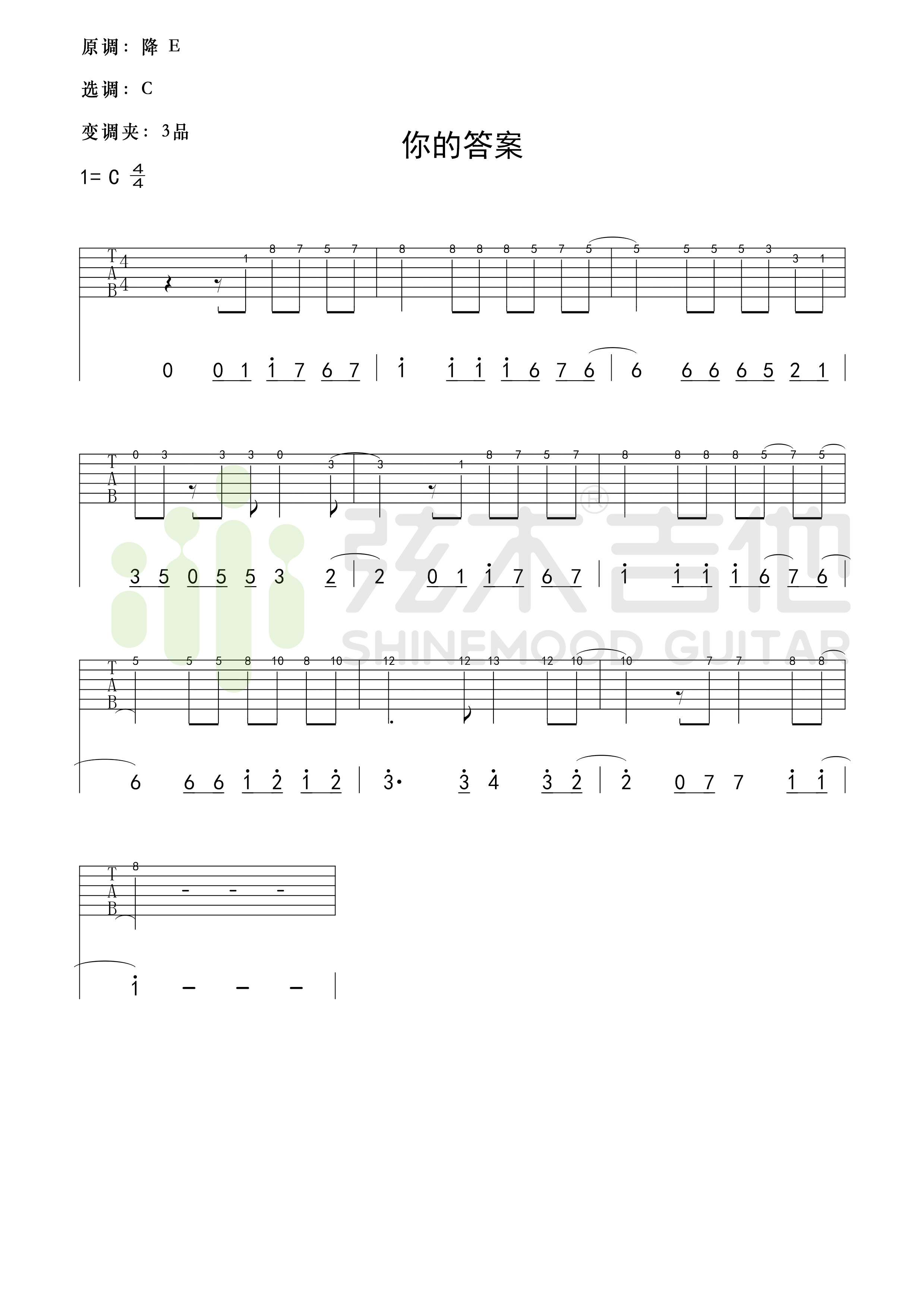 曲谱介绍: 阿冗《你的答案》吉他独奏谱,共有1张高清图谱,免翻页排版设计。