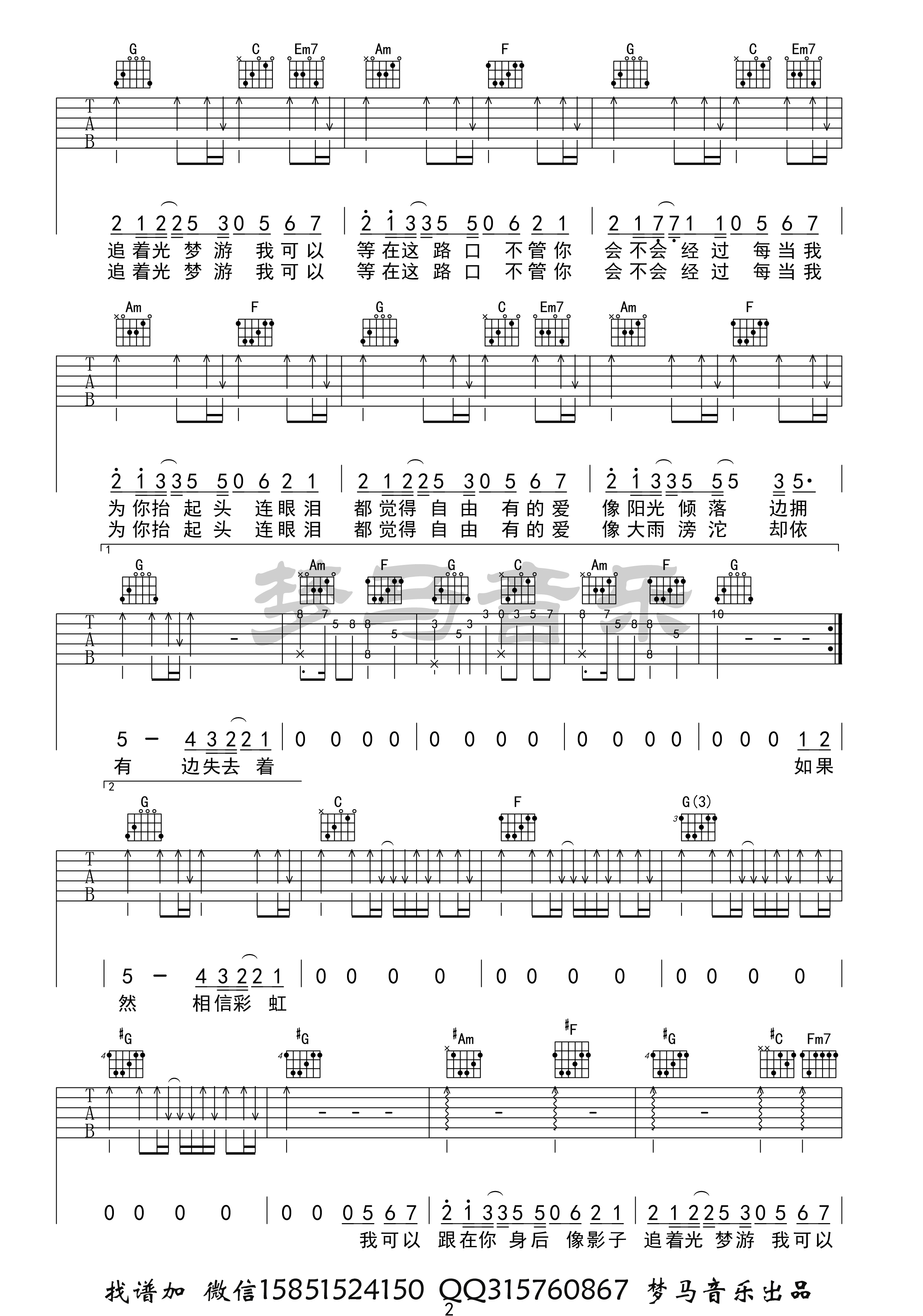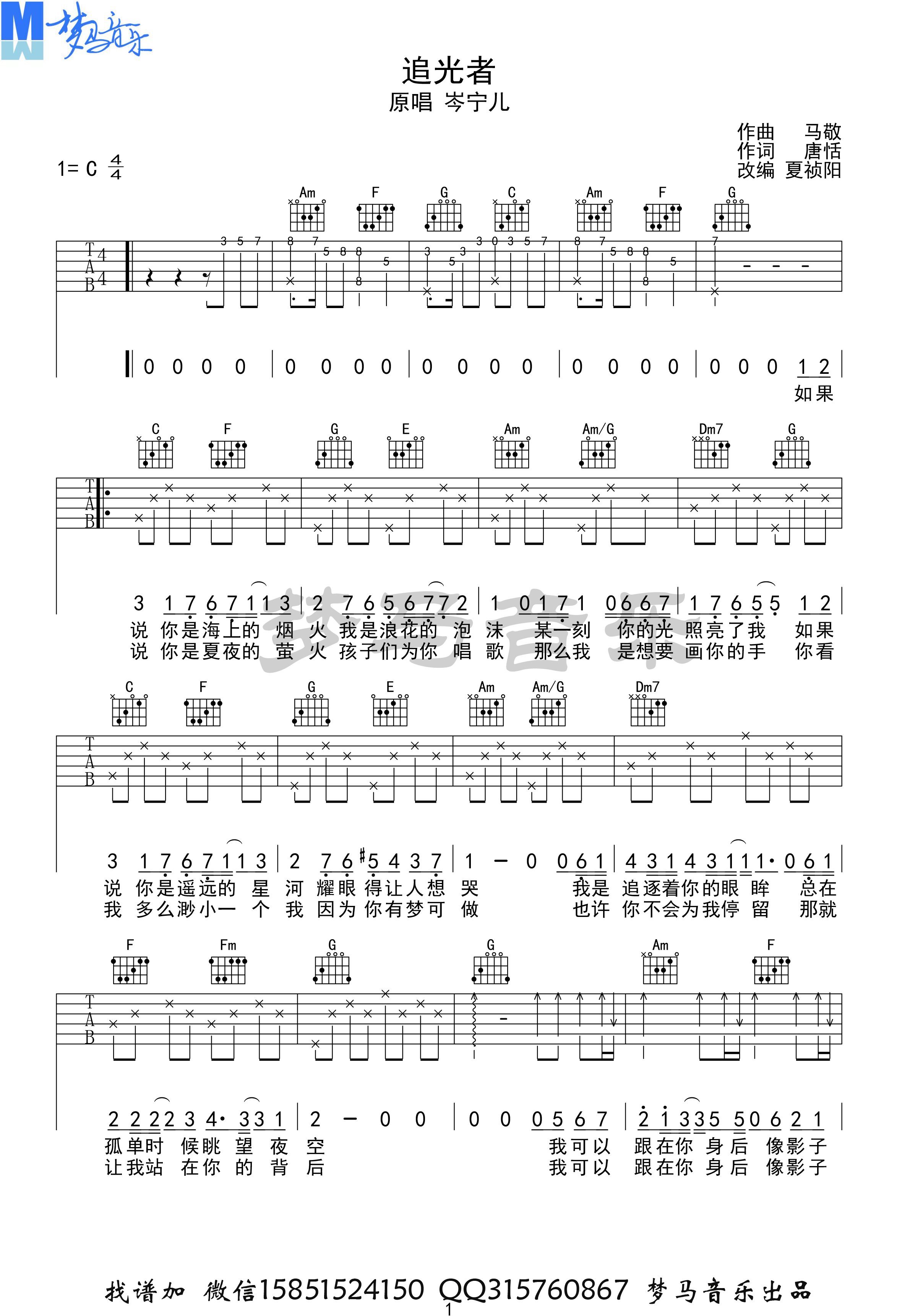 曲谱介绍: 岑宁儿《追光者》吉他弹唱谱,共有3张高清图谱。