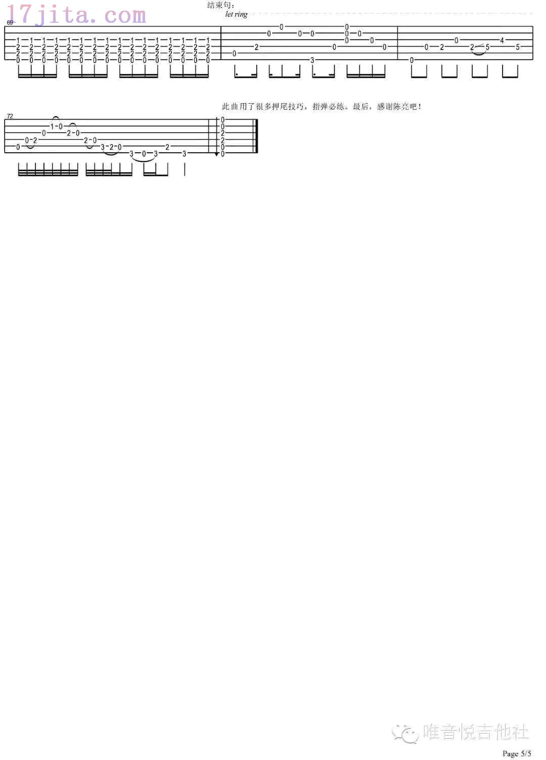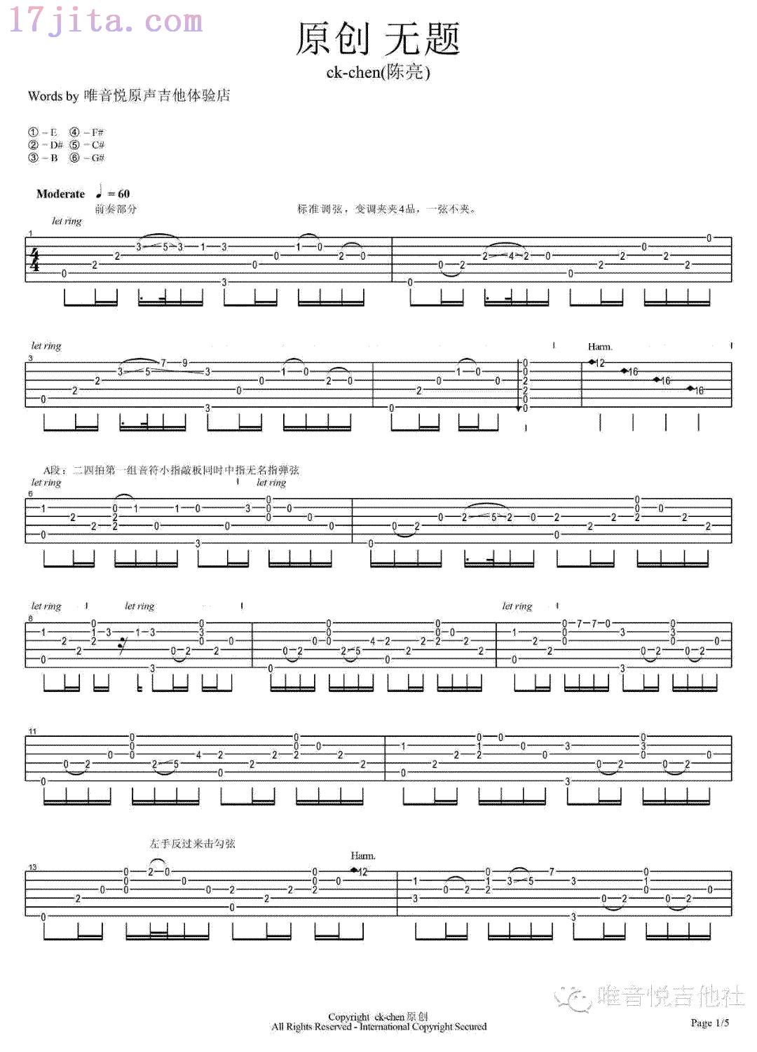 曲谱介绍: 陈亮《无题》指弹谱,学吉他者必会的炫技曲目,无题独奏独奏谱,标准调弦,变调夹夹四品,一弦不夹。唯音悦编配制谱,17吉他网更新上传。 《无题》由中国风指弹的代表人物陈亮老师所作。虽然这首指弹曲目有一定难度,确是一首十分经典的入门神曲。演奏过程中会运用到很多指弹技巧,需要大家多花时间进行练习。