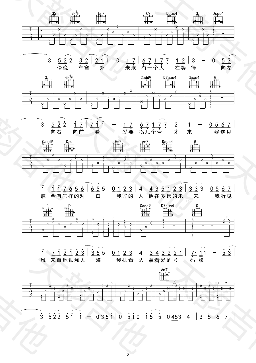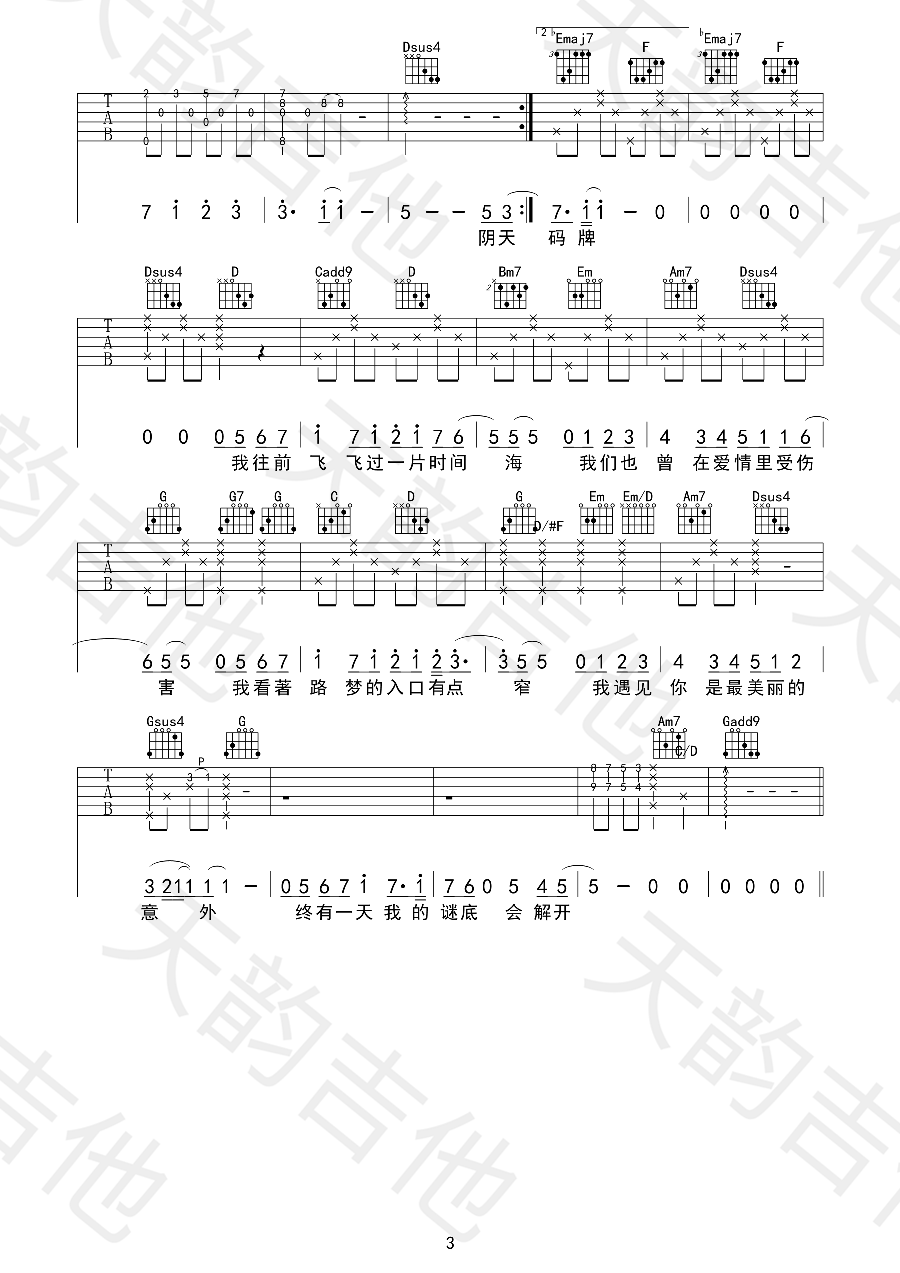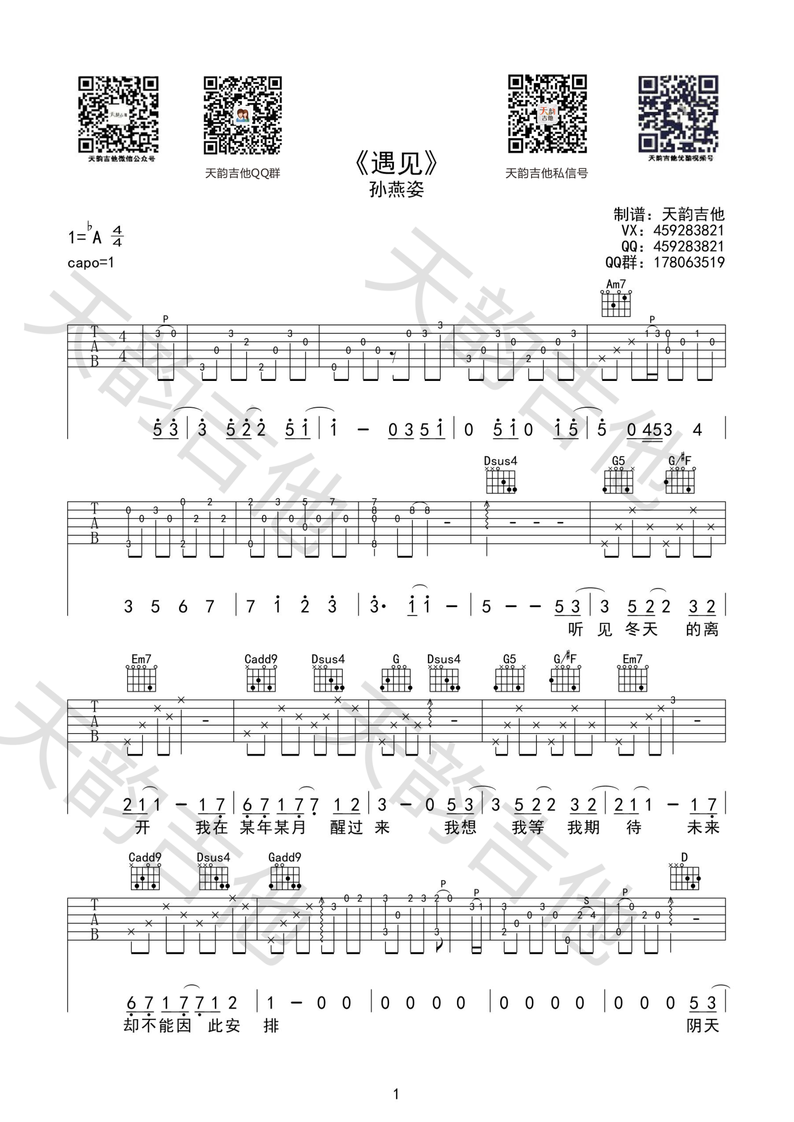 曲谱介绍: 孙燕姿《遇见》吉他弹唱谱,共有3张高清图谱。