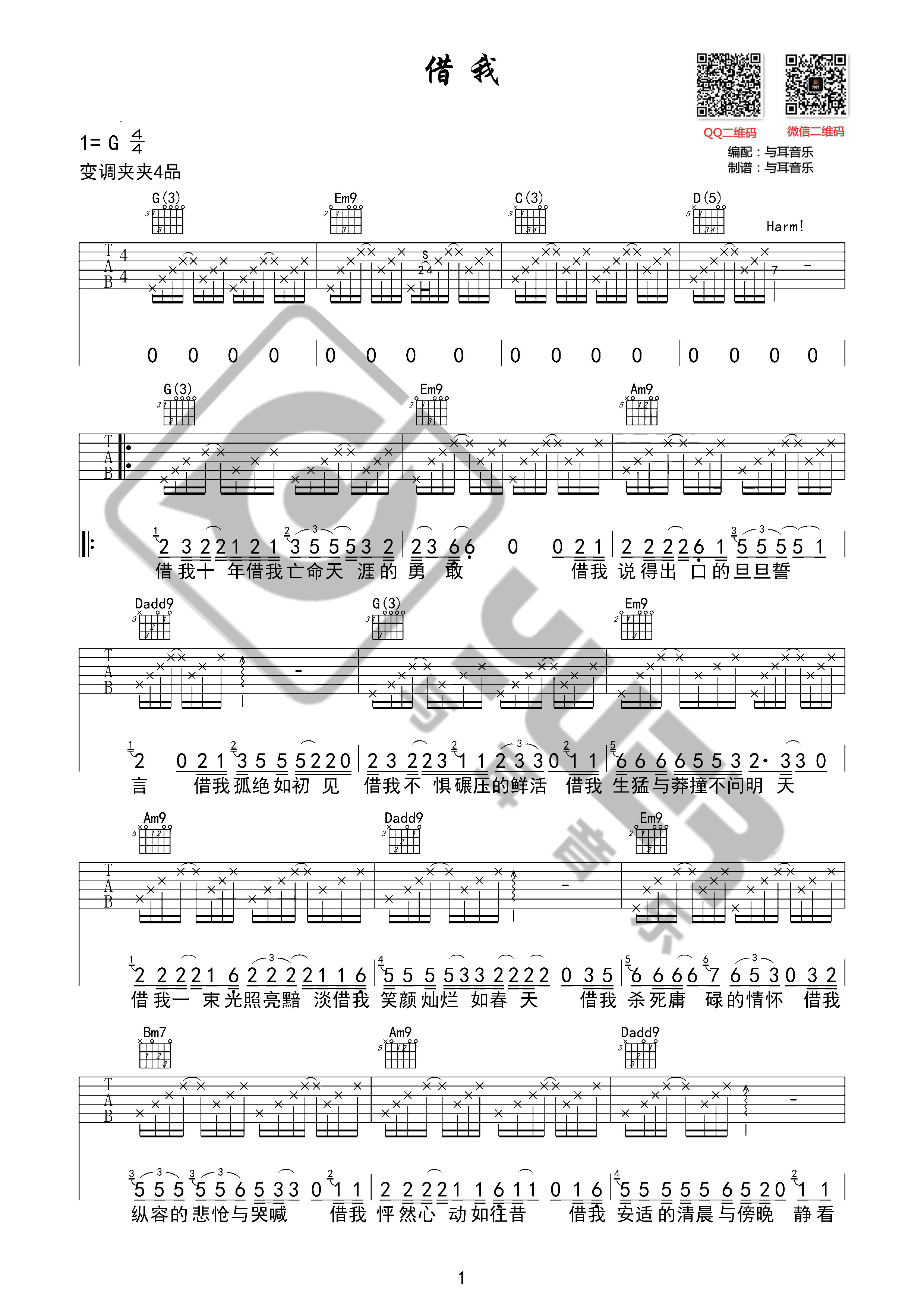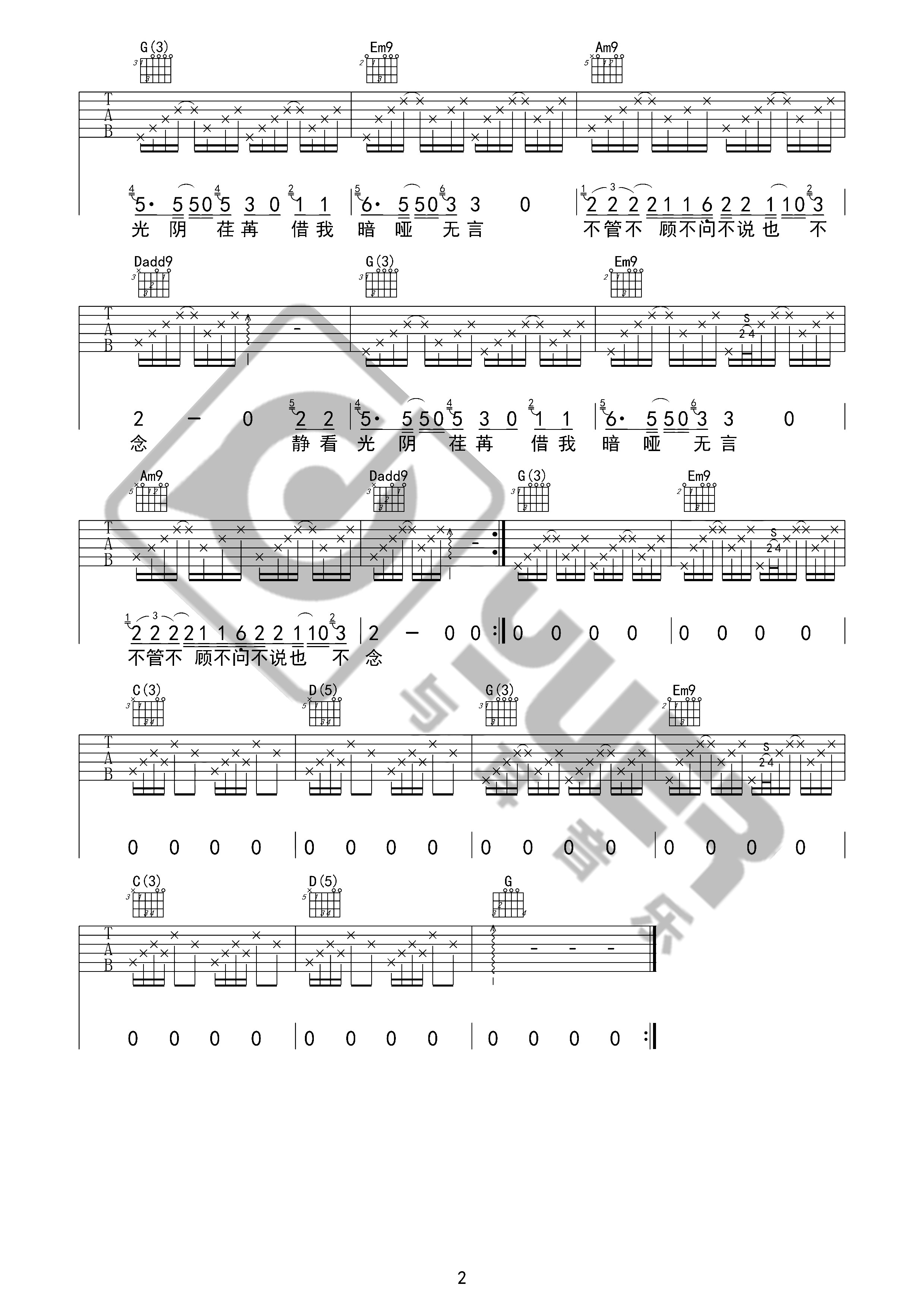 曲谱介绍: 谢春花《借我》吉他弹唱谱,共有2张高清图谱,免翻页排版设计。
