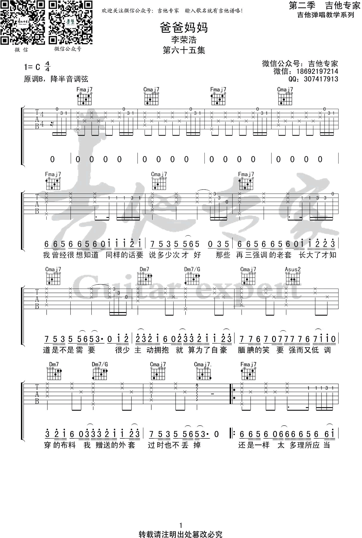 曲谱介绍: 《爸爸妈妈》吉他谱,李荣浩一首献给父母的歌,爸爸妈妈吉他弹唱谱,三张图片六线谱,原调B降半音调弦,选用C调指法编配,吉他专家制谱分享,上传收藏。