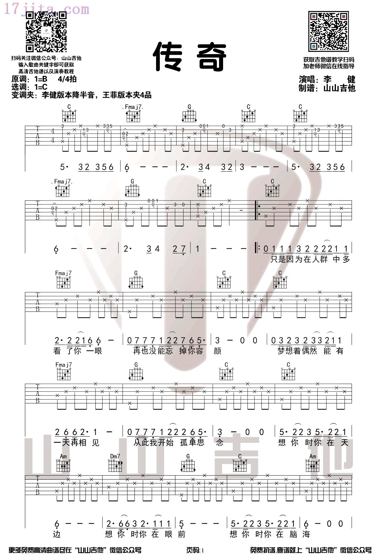 曲谱介绍: 《传奇》吉他谱,李健原唱,央视春晚让这首歌广为传唱。传奇六线谱,变调夹李健版本降半音,王菲版本夹四品。两张弹唱图片谱,山山吉他编配分享,17吉他网上传更新。 一首很特别的歌,没有明显的起伏却情感饱满,好似一个人在低低地诉说自己的心事。吉他谱选用C调和弦编配,编有前奏和间奏,整体难度不大,适合新手练习,喜欢这首歌曲的话就赶紧跟着山山老师的演示视频一起学习吧~