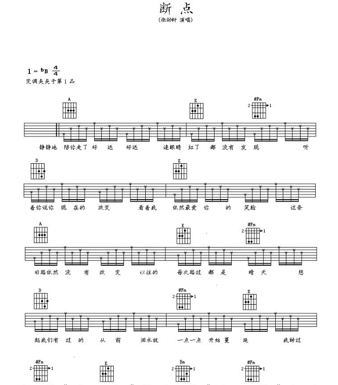 曲谱介绍: 张敬轩《断点》吉他弹唱谱,共有2张高清图谱,免翻页排版设计。