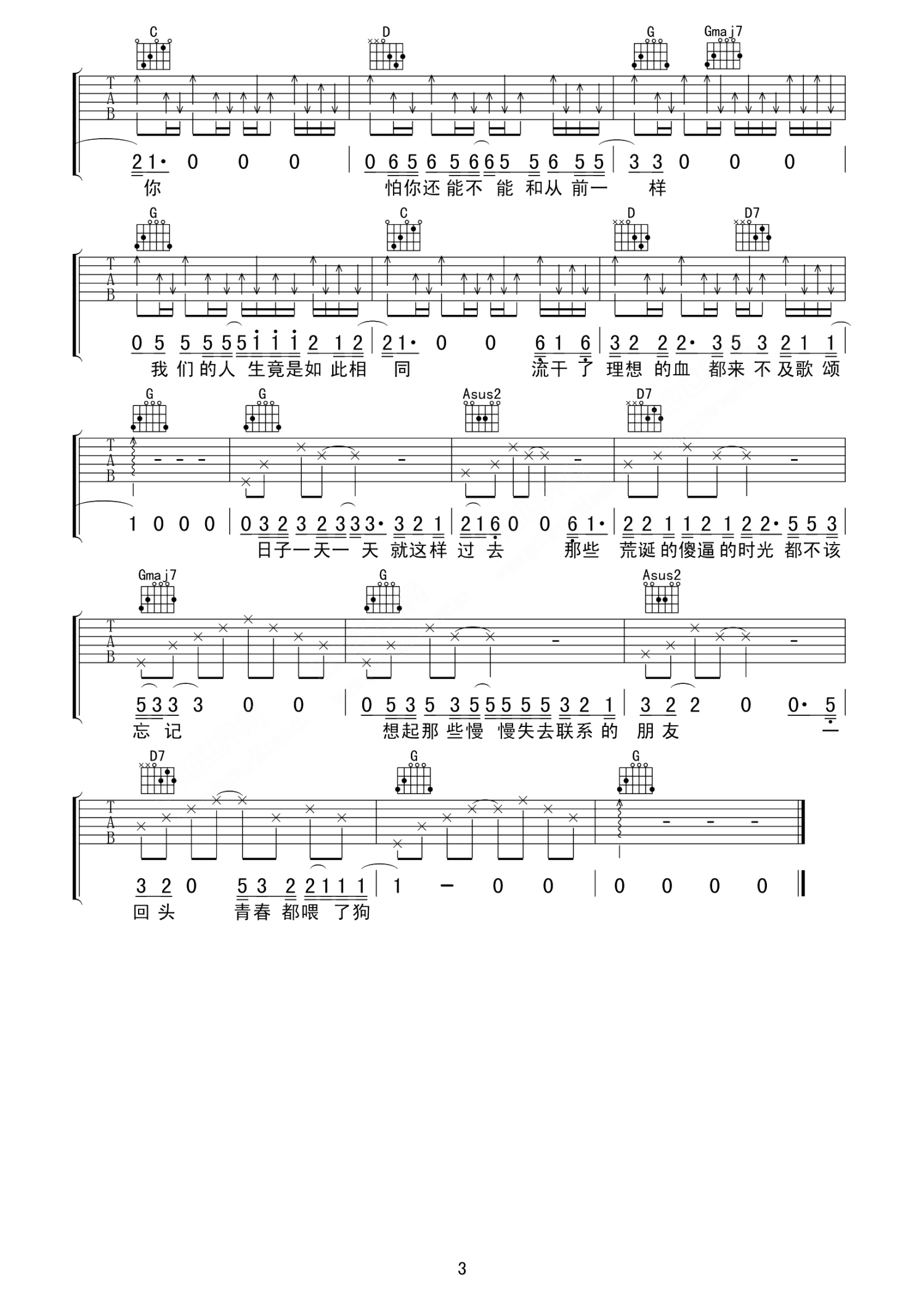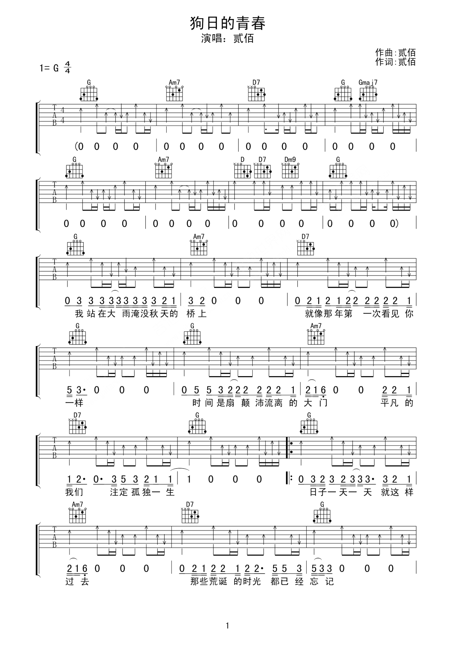 曲谱介绍: 贰佰《狗日的青春》吉他谱_G调吉他弹唱谱