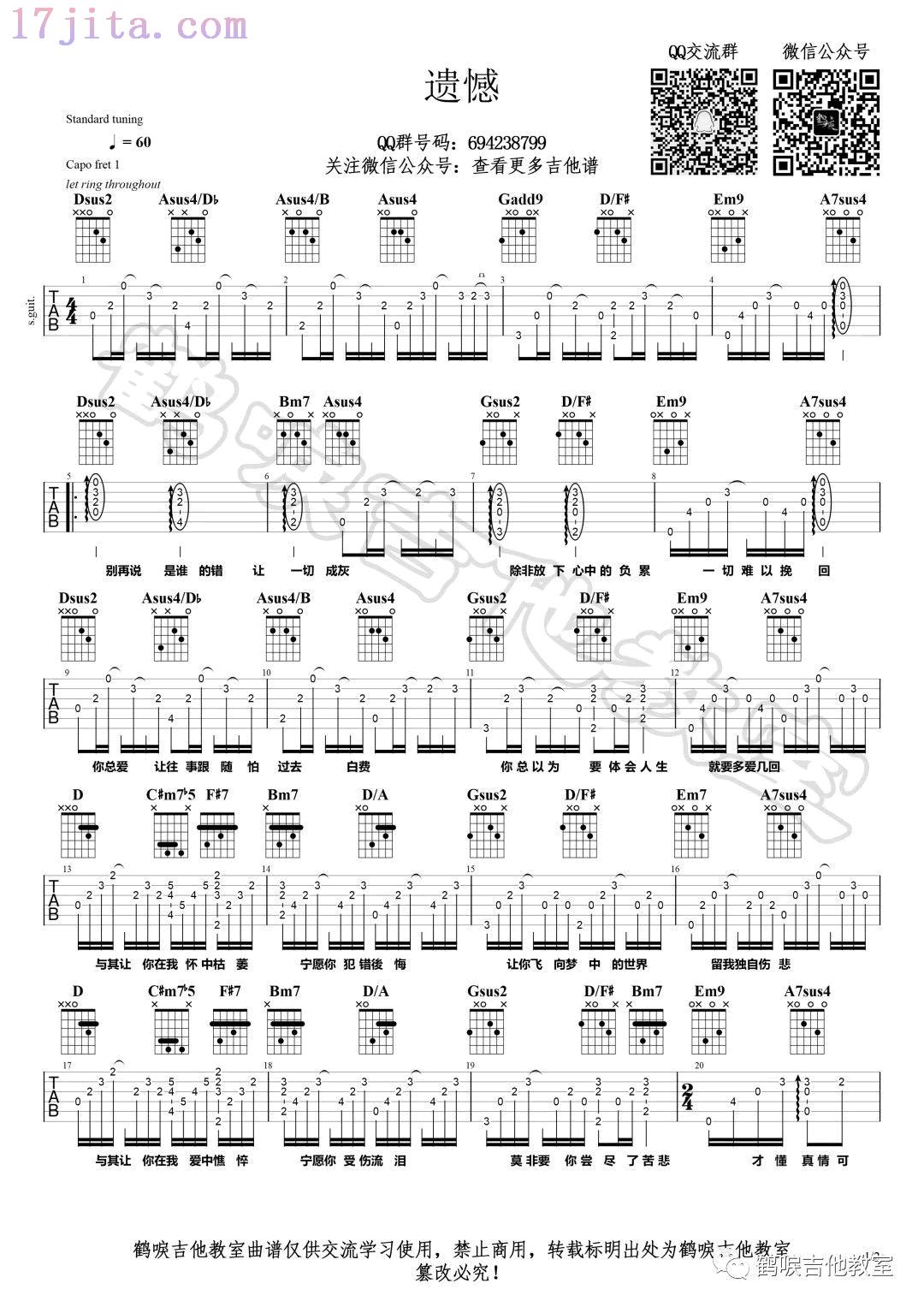 曲谱介绍: 《遗憾》吉他谱,陈洁仪演唱,许美静原唱的一首经典情歌。遗憾六线谱,CAPO夹一品,鹤唳吉他教室编配出品,17吉他网上传更新。
