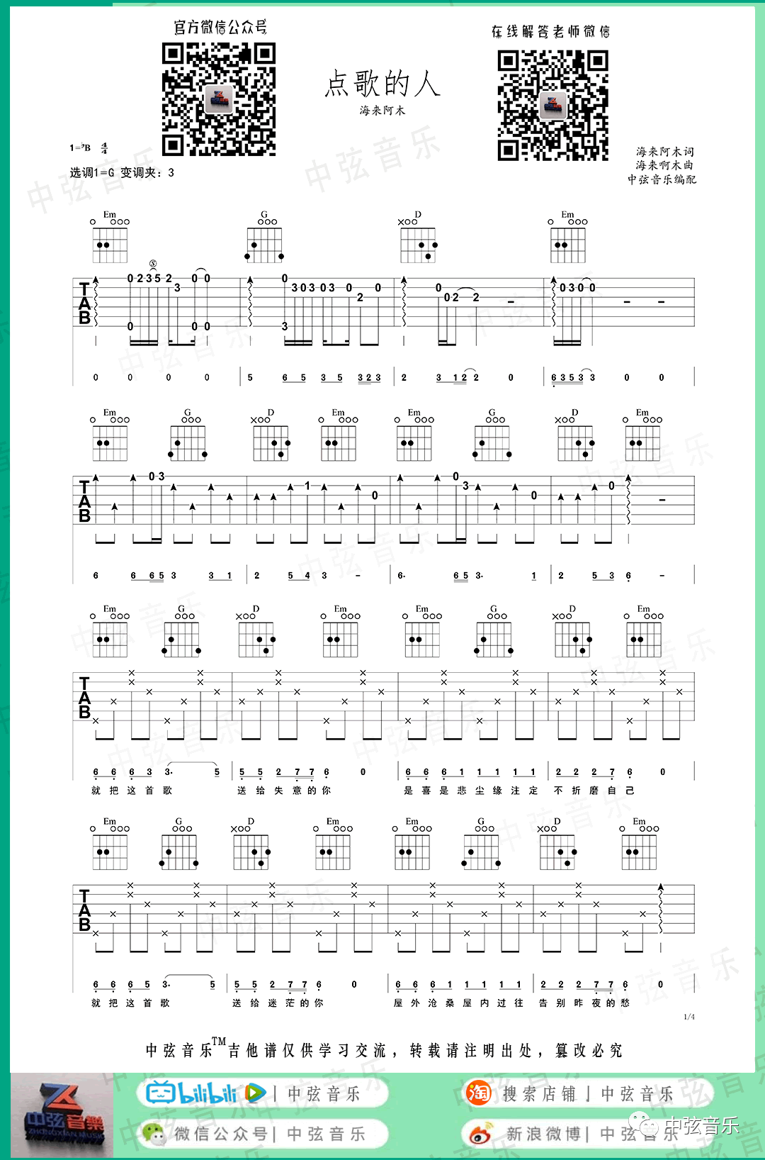 曲谱介绍: 点歌的人吉他谱,海来阿木的一首网络热门歌曲,选用G调指法,变调夹夹三品。点歌的人六线谱,完整编配共四张弹唱图片谱。中弦音乐制谱分享,更新上传。 彝族歌手海来阿木的又一力作,一首沧桑的歌献给你,人的一生啊就一步步坎坷,动感的音乐有灵魂的声音,穿透了所有人的心。愿点歌的人、听歌的人、唱歌的人、看到的人、都是幸福的人。