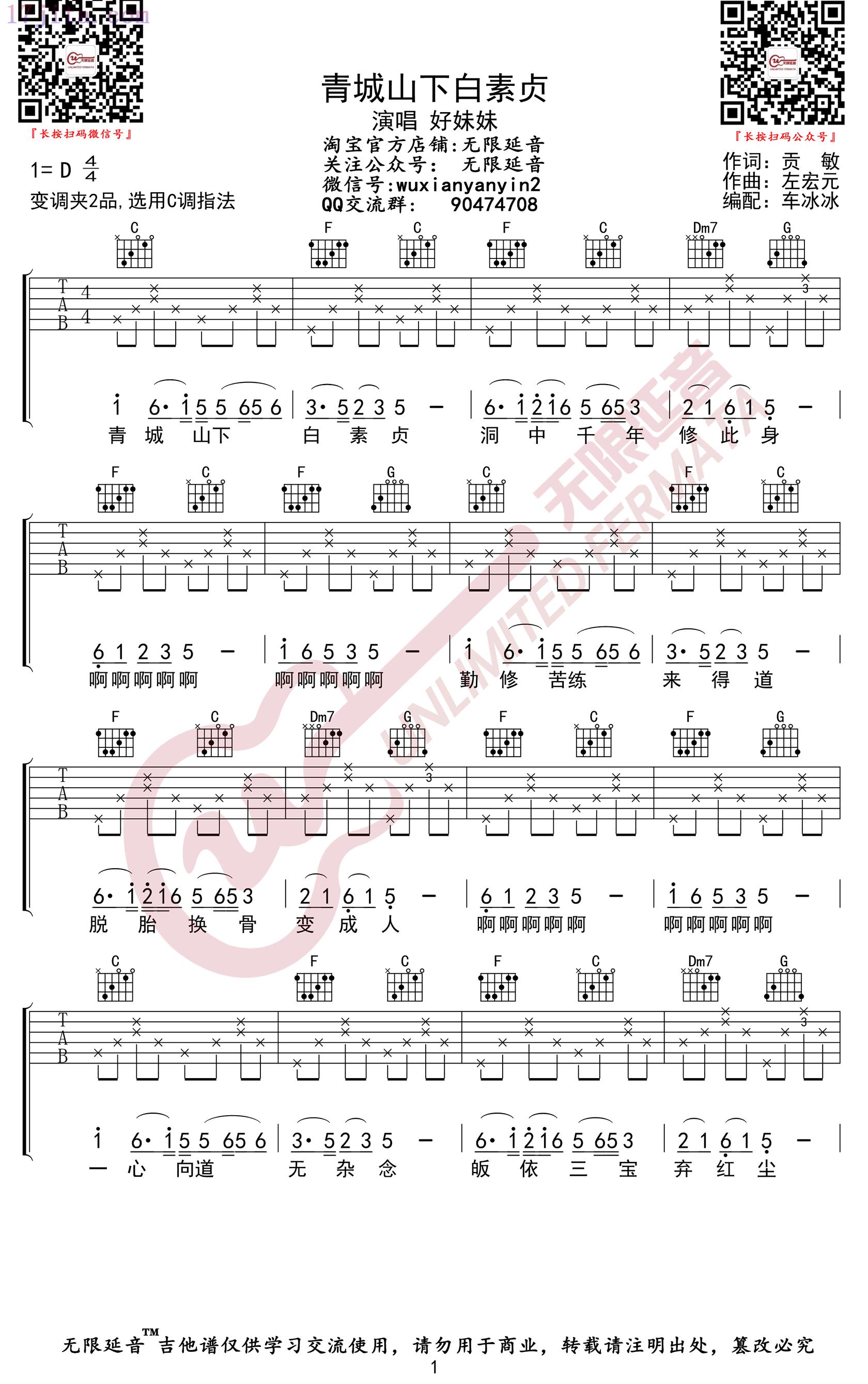 曲谱介绍: 《青城山下白素贞》吉他谱,好妹妹乐队演唱,原曲为电视剧《新白娘子传奇》唱段。青城山下白素贞六线谱,选用C调指法,变调夹夹第二品,两张弹唱图片谱。无限延音编配,17吉他网更新上传。 这首歌曲本是影视插曲,至今衍生出的版本多到数不过来,而把经典翻出原唱气质的当属好妹妹乐队,深沉磁性的声音,像一台时光机,任由细腻的旋律和歌词得到新生。让人们感受到老歌动听的古风民谣的美好。
