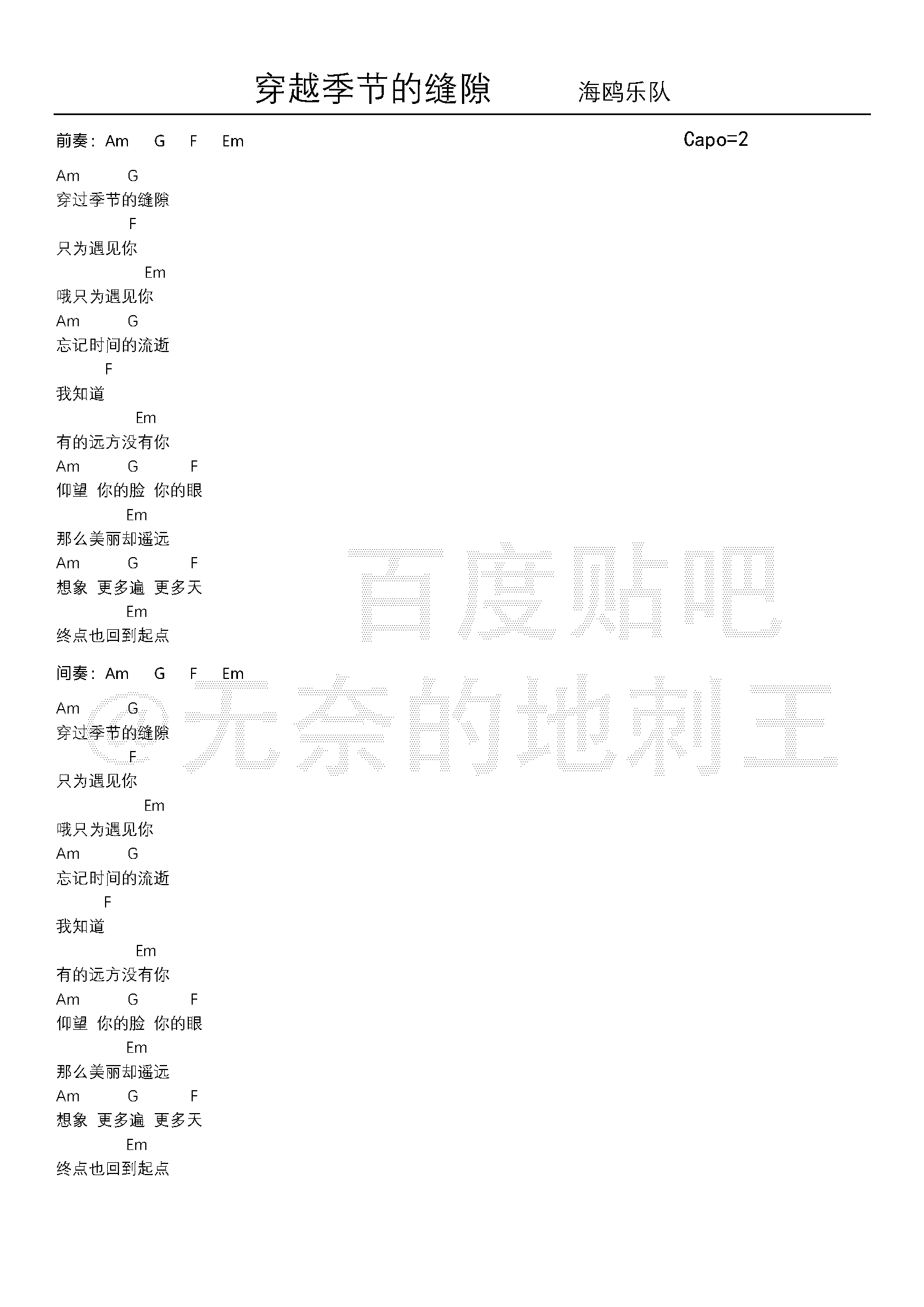 曲谱介绍: 海鸥乐队《穿越季节的缝隙》吉他弹唱谱,共有1张高清图谱,免翻页排版设计。