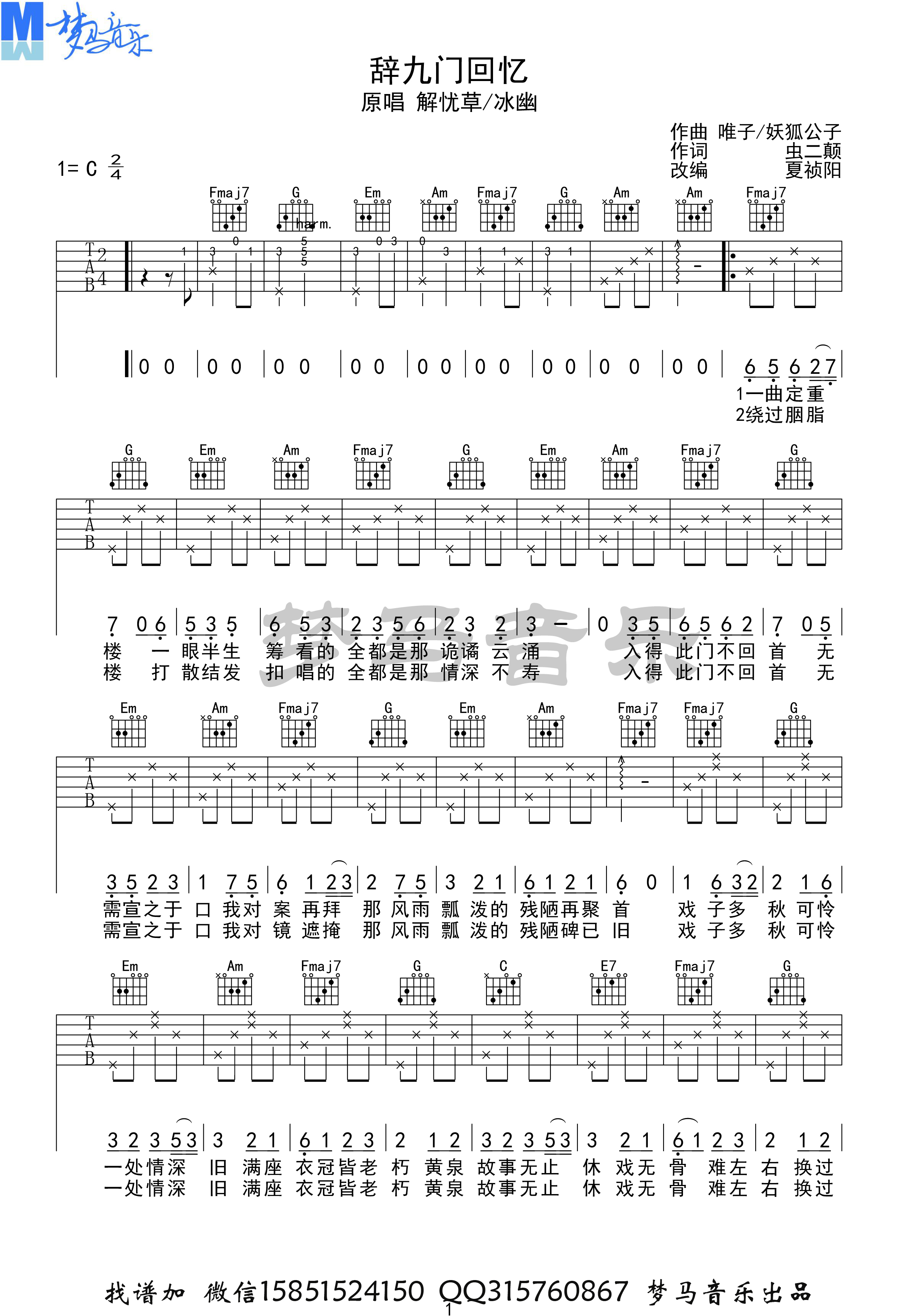 曲谱介绍: 《辞九门回忆》吉他弹唱谱,共有2张高清图谱,免翻页排版设计。