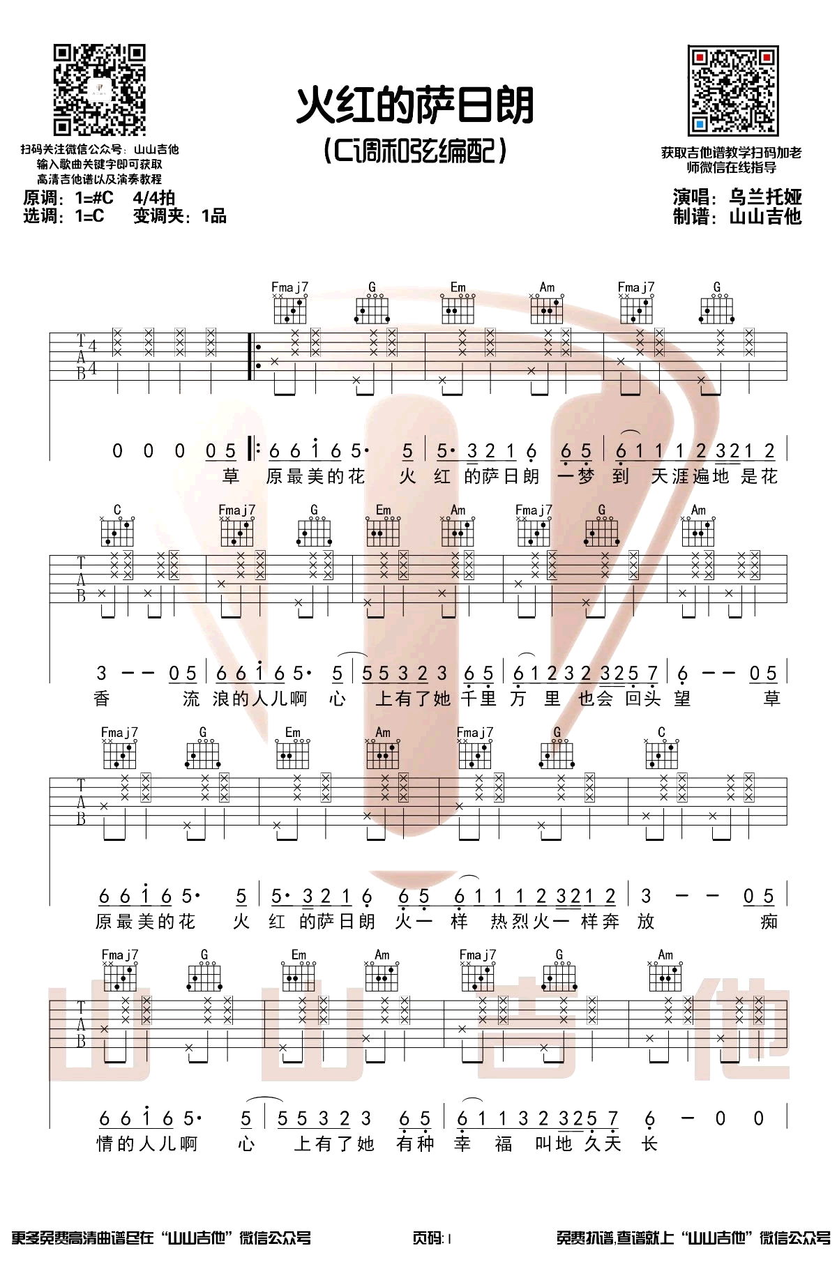 曲谱介绍: 《火红的萨日朗》吉他谱,乌兰图雅演唱的一首草原牧歌,最近由要不要买菜翻唱而爆红网络。火红的萨日朗六线谱,C调和弦编配,山山吉他制谱分享,整理上传。 萨日朗是一种草原之花,颜色鲜红,就像火一样,这首歌曲以火红的萨日朗为名,象征着对美好生活的向往,正如歌词所说,绵延大道有多远,幸福生活有多长。火山老师也为大家录制了这首歌的吉他演奏版本,大家快来一起听听吧!
