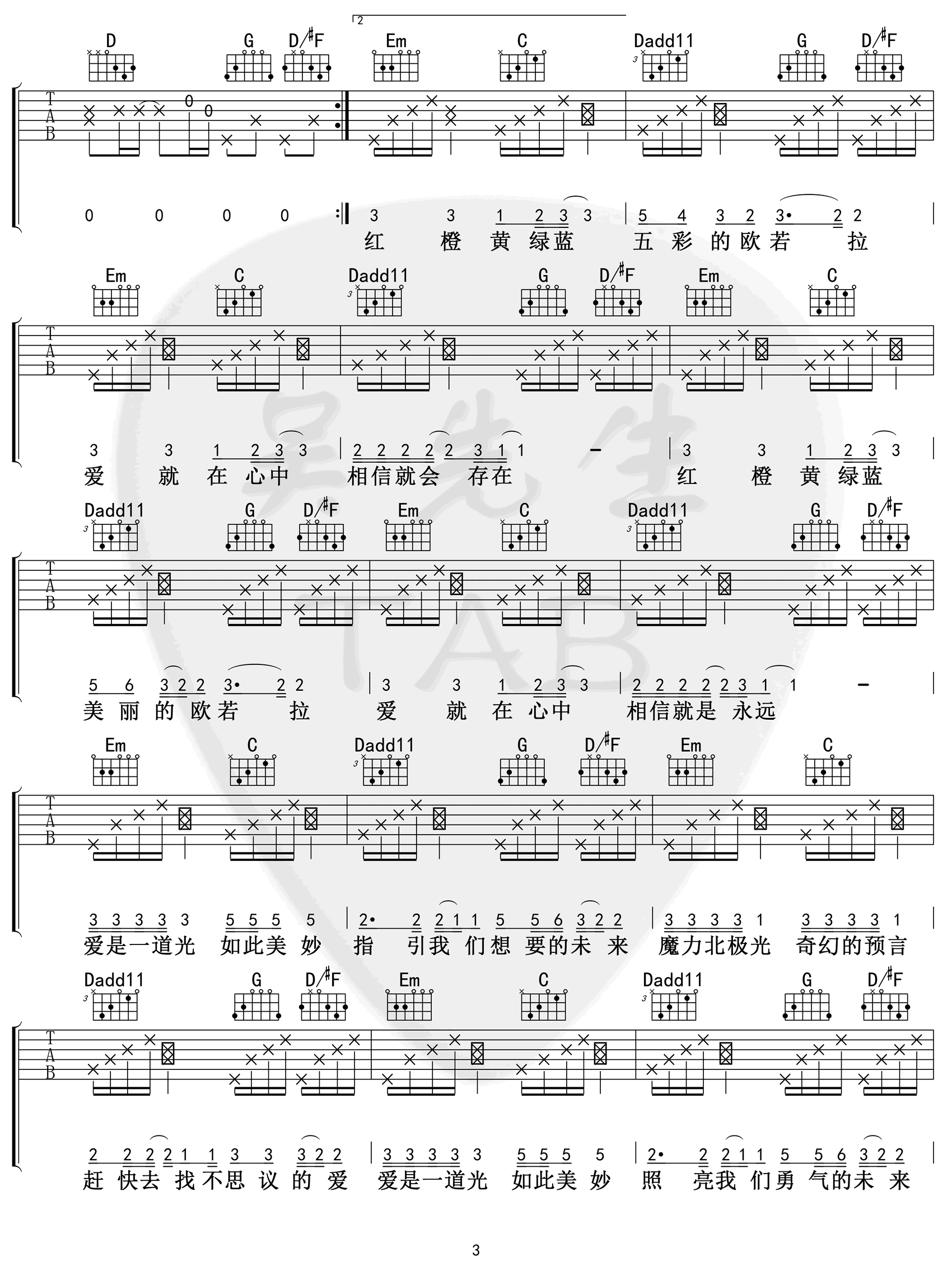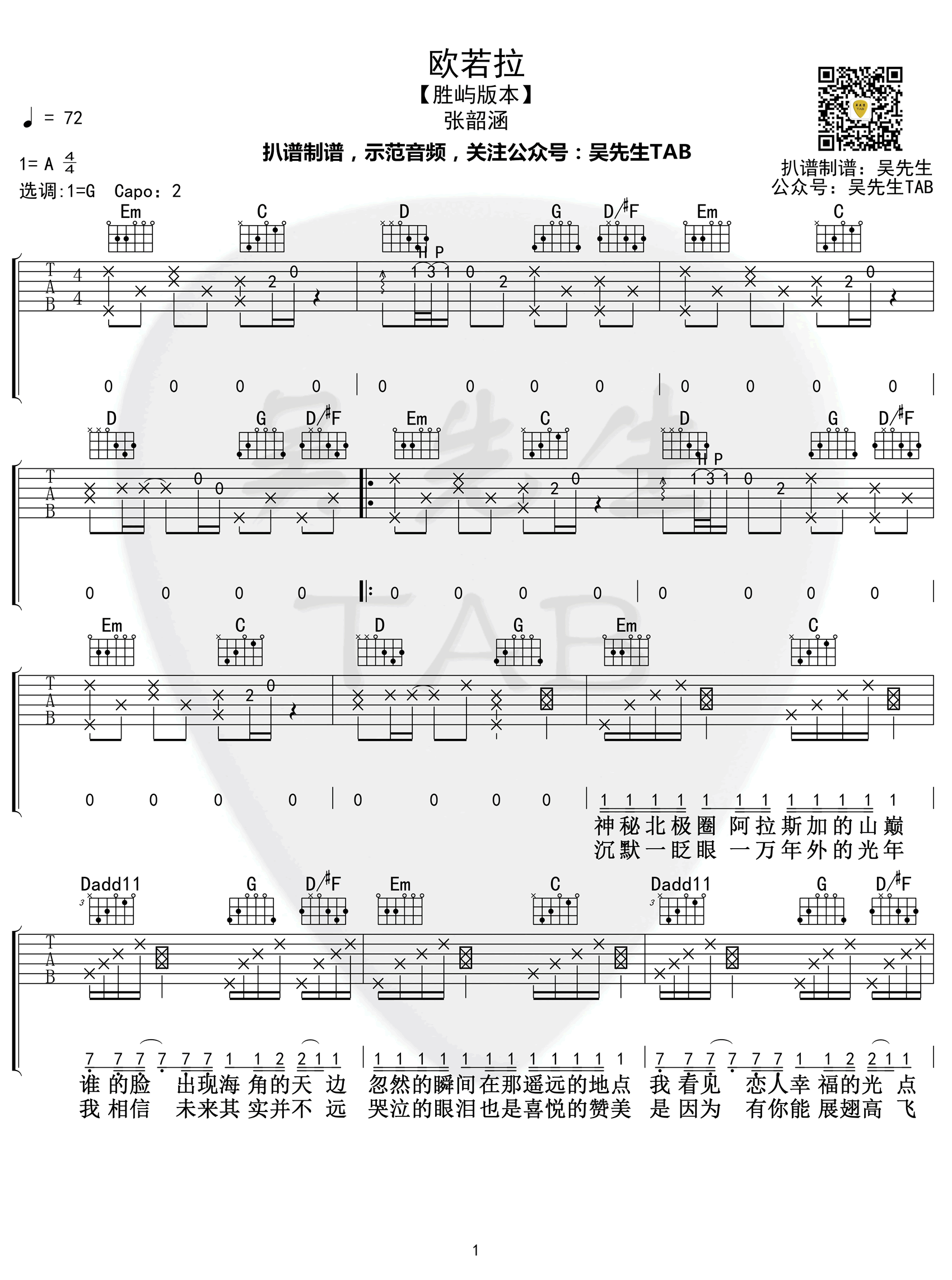 曲谱介绍: 《欧若拉》吉他谱,胜屿版本,张韶涵原唱的一首经典老歌。欧若拉六线谱,原调A,选调G,Capo夹二品。完整编配共四张高清图片谱,吴先生扒谱制谱,整理上传分享。 这首当年火遍大江南北的歌曲《欧若拉》经过了15年的沉淀,最近由于胜屿在抖音翻唱,又再度翻红,且听出了不一样的温情。所以说,好歌永远不会过时。PS:张韶涵版本是F调,变调夹夹5品用C调指法就是:Am--F--G--C-G/B-
