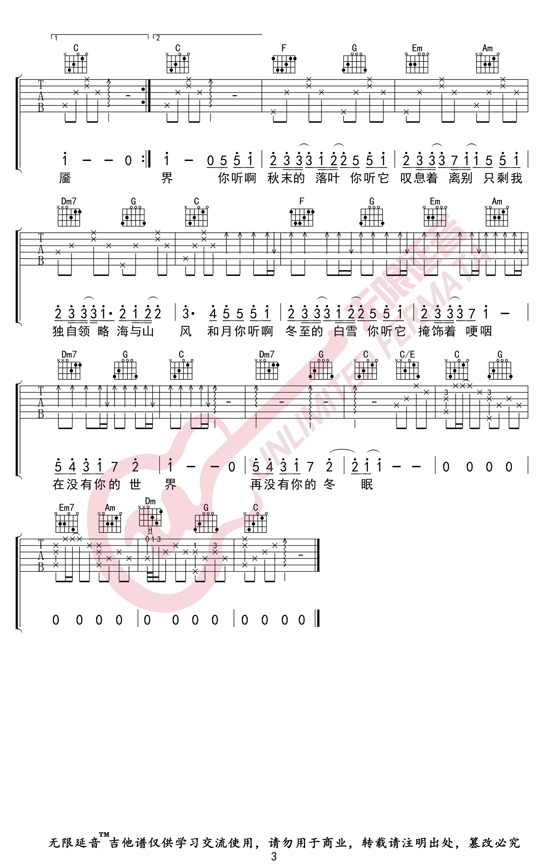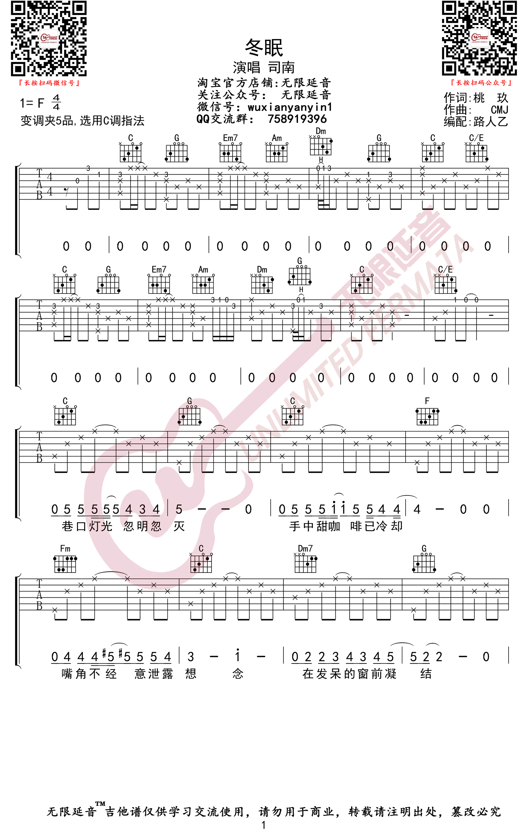 曲谱介绍: 《冬眠》吉他谱,司南演唱,第一次听就被这首歌的旋律吸引。冬眠六线谱,原调F,变调夹夹五品,选用C调指法。三张高清图片谱,感谢无限延音制谱编配,整理上传。