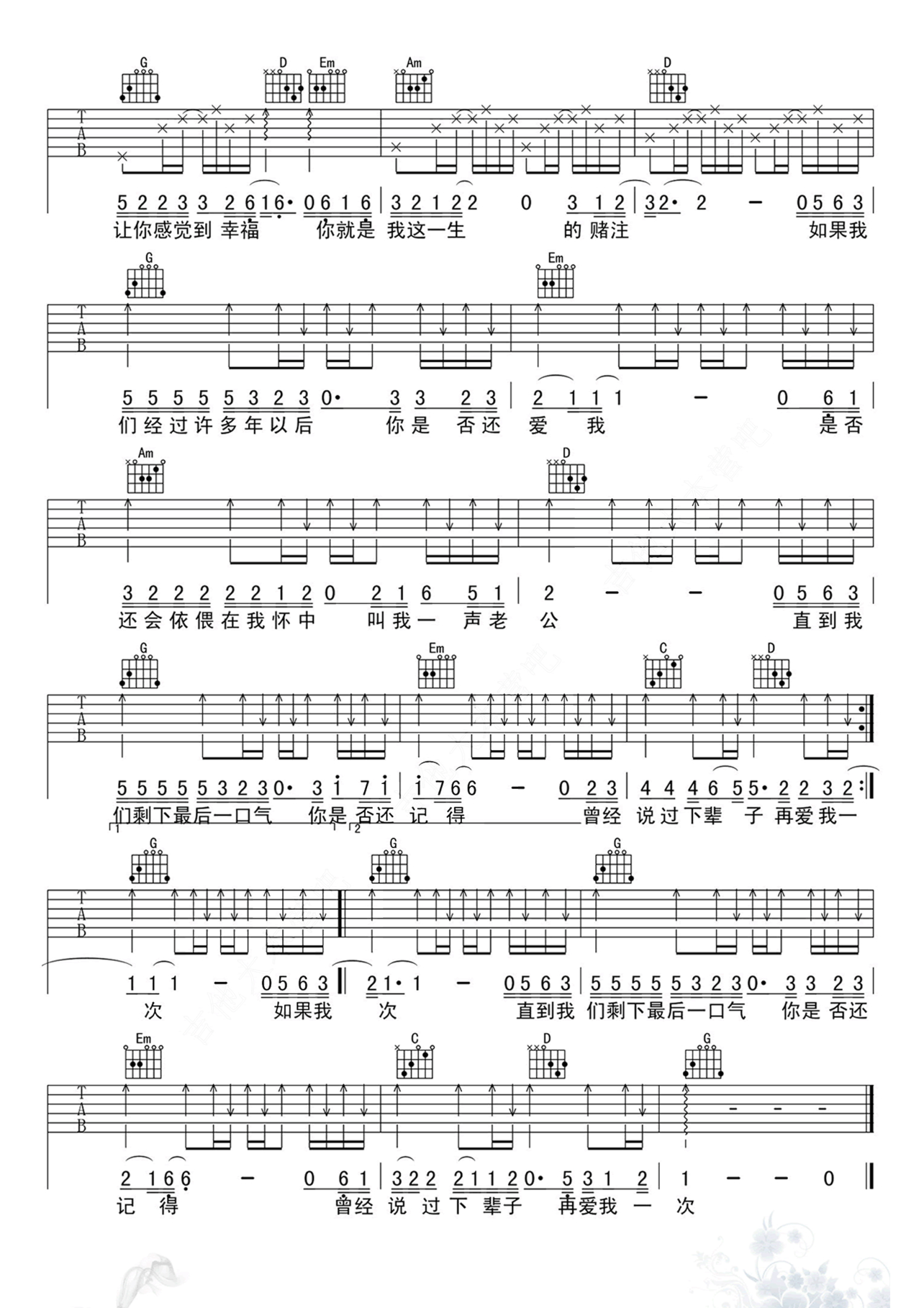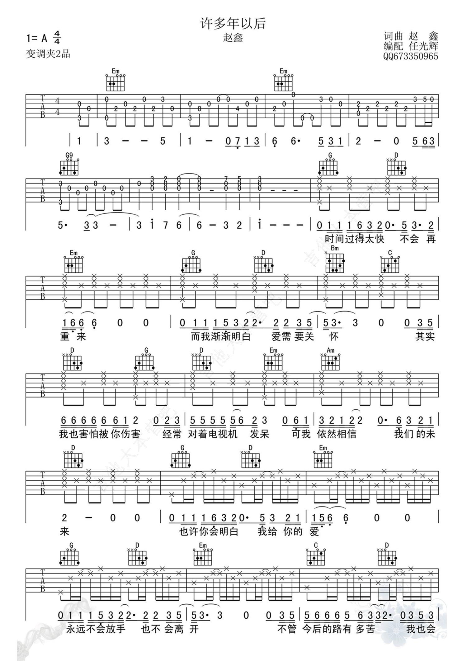 曲谱介绍: 变调夹夹第二品。许多年以后,是否还记得曾经爱着的那个人?是否还记得当初的自己?我在这里,你在哪里?爱一首歌,常常是因为某句歌词,但真正动人的不是那句歌词,而是在你生命中那些关于这首歌的故事。