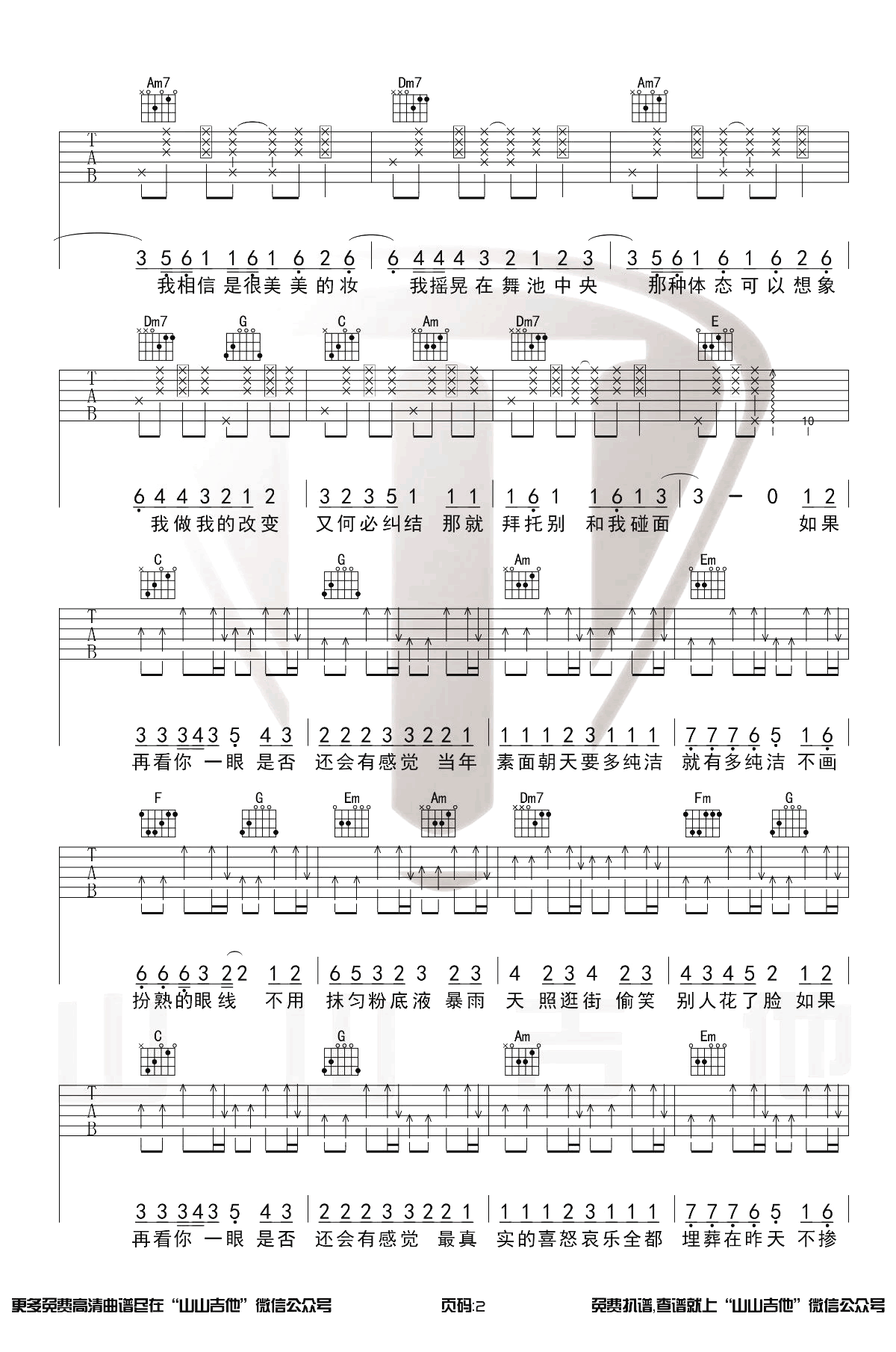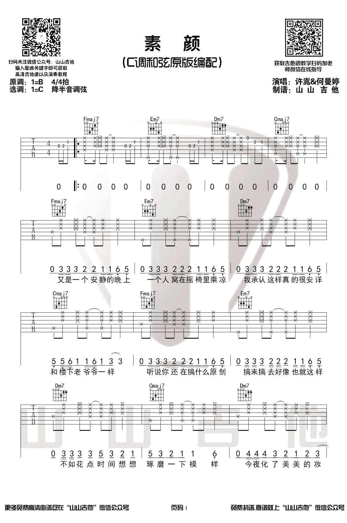 曲谱介绍: 《素颜》吉他谱,许嵩何曼婷的一首男女对唱情歌,素颜六线谱,C调和弦原版编配,降半音调弦,三张图片谱,山山吉他编配制谱,整理上传。