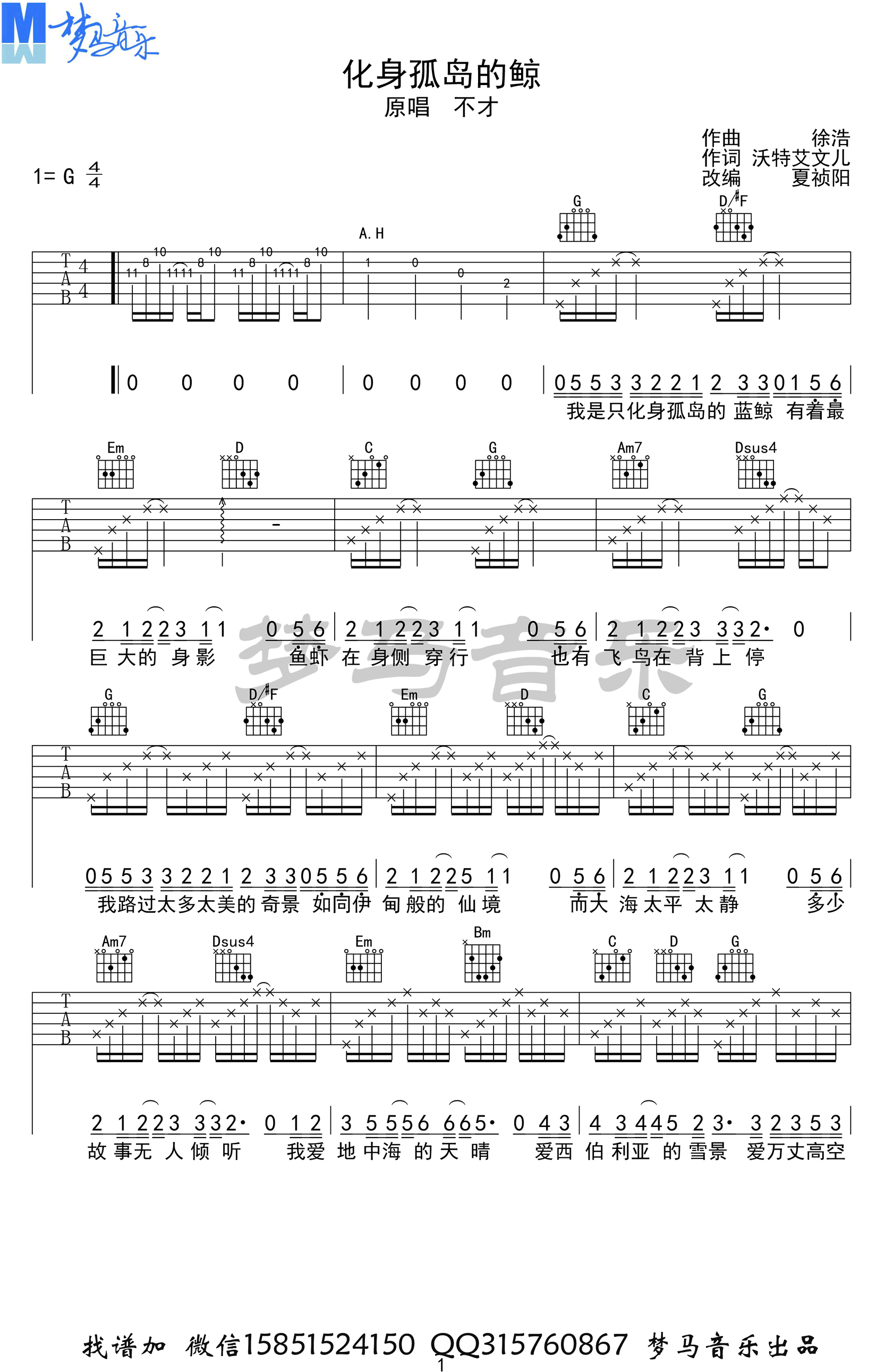 曲谱介绍: 化身孤岛的鲸吉他谱,周深演唱,化身孤岛的鲸六线谱,G调弹唱谱,完整版共五张高清图片谱。梦马音乐编配,随谱附上《化身孤岛的鲸》吉他弹唱演示视频,整理分享。 夏祯阳老师编配说明:《化身孤岛的鲸》是我偶然间听到的一首歌。我很喜欢它的歌词,旋律也是越听越好听。我不知道这首歌到底火不火。我就想把这首歌作为与孙小南合作的翻唱系列的收官之作。歌曲开头我用了一些MIDI,想把这首歌的意境营造出来。空旷的大海上,小鸟在空中叫着,一只鲸鱼孤独的在海里边游边歌唱!希望大家喜欢这个作品!
