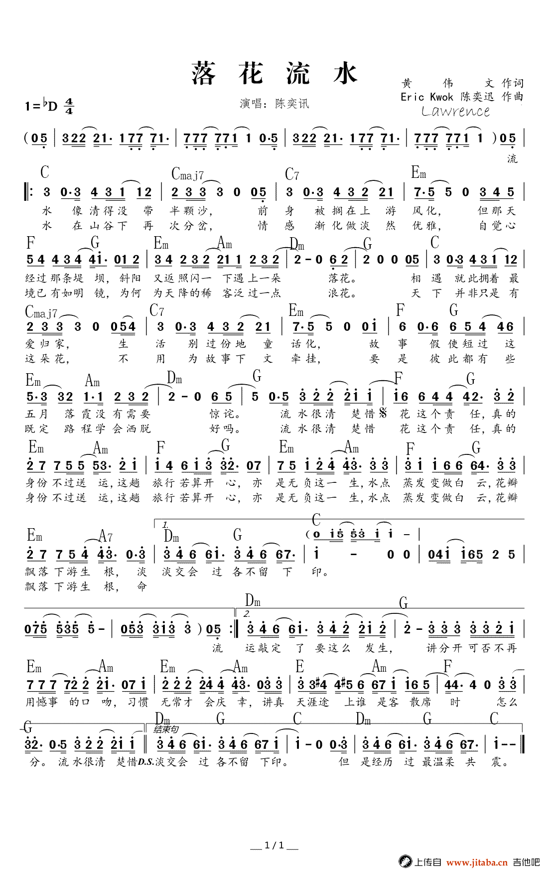 曲谱介绍: 《落花流水》吉他弹唱谱,共有1张高清图谱,免翻页排版设计。