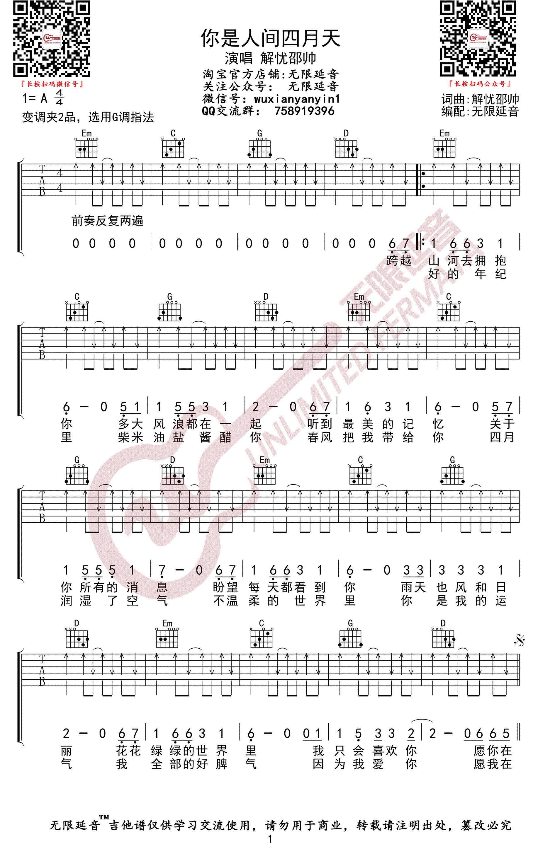 曲谱介绍: 《你是人间四月天》吉他谱,解忧邵帅创作演唱的民谣歌曲,你是人间四月天六线谱,原调A调,变调夹夹第二品,选用G调指法。三张图片谱高清版,无限延音编配出品,整理更新。 歌曲的灵感来自于林徽因的《你是人间的四月天》。就像诗歌一样,歌曲唱的也是爱、是暖是希望……轻快的旋律加上温暖的歌词,让人仿佛置身暖阳之中,感受到的都是惬意的美好。