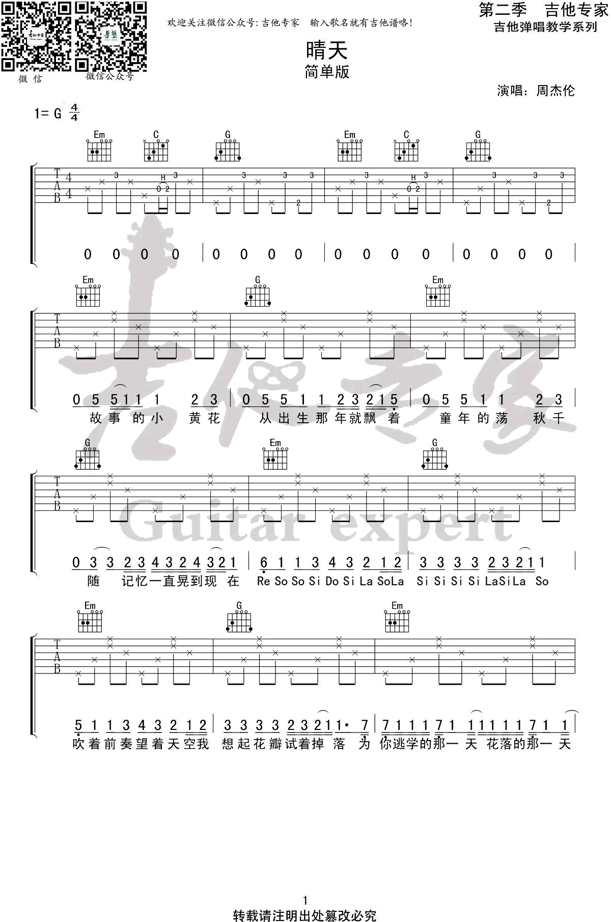 曲谱介绍: 《晴天》吉他谱,周杰伦一首经典代表作品,那些青春的纪念,每一段被遗忘的时光都藏在旋律中。晴天吉他弹唱谱,G调指法简单版编配,三张高清图片六线谱。吉他专家制谱出品,更新上传。 老师编配说明:这是03年的老歌了,网上有很多版本谱子,不过新手不好操作,就定制了一份简单容易上手,对初学者极度友好的谱子,也分享给大家!