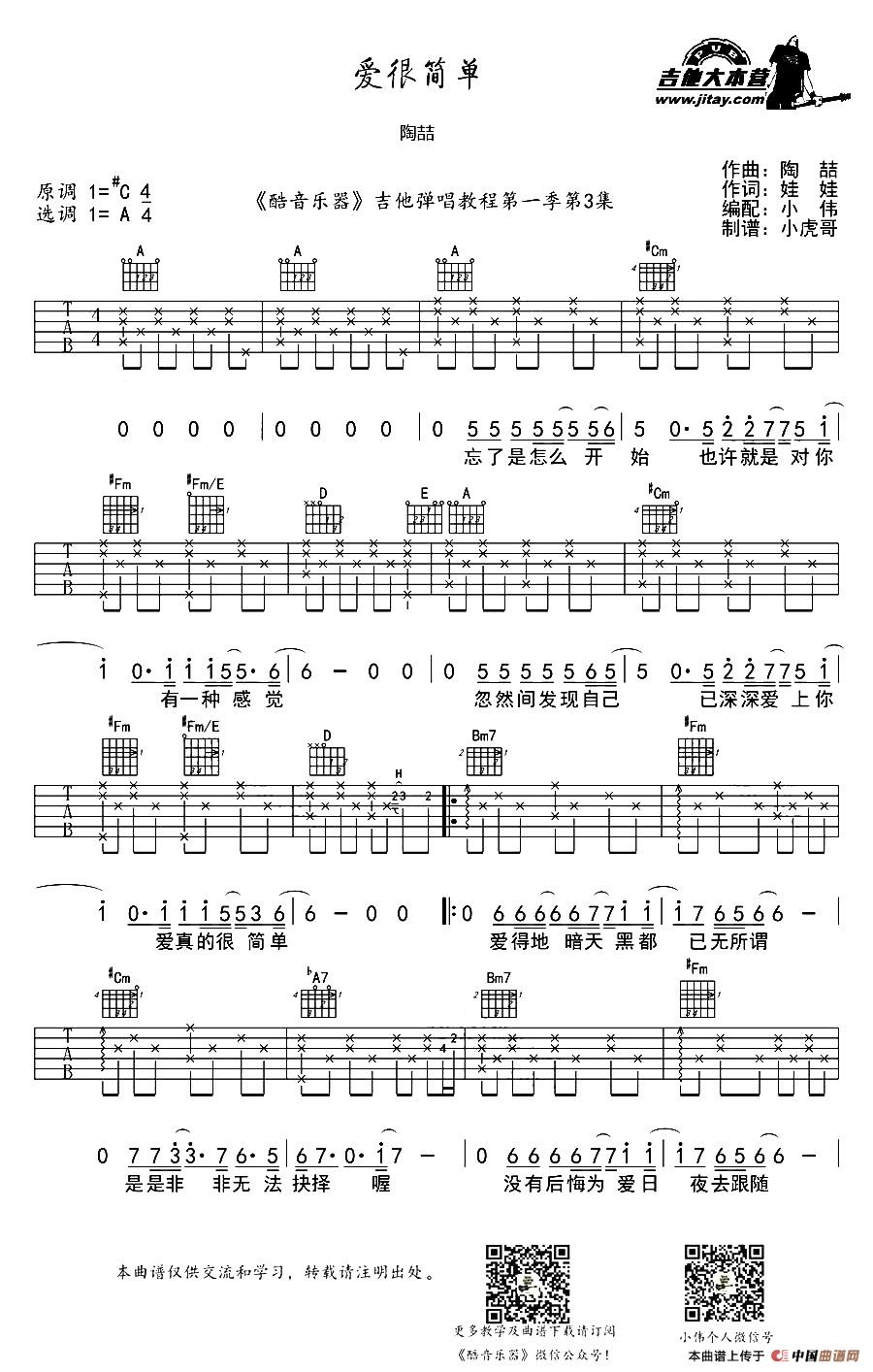 曲谱介绍:   爱很简单(陶喆)吉他谱:爱很简单(陶喆)吉他谱该歌谱演奏者为陶喆,歌曲名称为爱很简单,歌谱类型为。《爱,很简单》是由娃娃填词,陶喆作曲、编曲、制作并演唱的一首歌曲(代表作),收录于陶喆1997年12月6日发行的同名专辑《DavidTao》中。