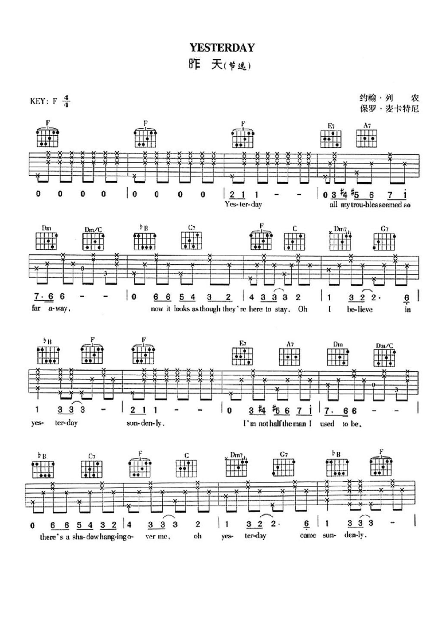 曲谱介绍: ThebeatlesYesterday吉他谱,披头士乐队经典英文歌曲《昨天》吉他弹唱谱,娓娓道来的歌声有着淡淡的忧伤弥漫开来,常常会感到如此神奇,某个时间,某个场景,配上一首歌.可以恰如其分地唱出你的心境,深深打开心扉,泛起一重又一重共鸣,Yesterday,回不去的旧时光,被改变的自己...我并没有成长在那个疯狂甲壳虫的年代,但我喜欢那些故事。
