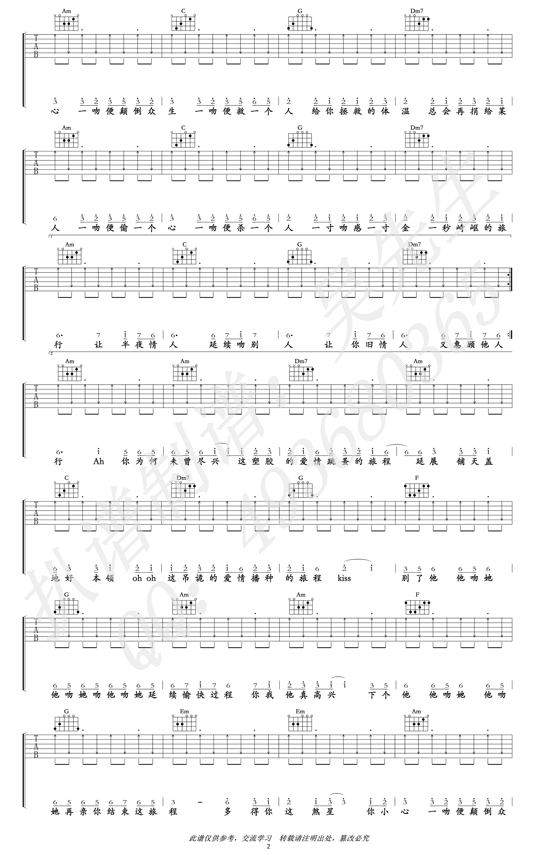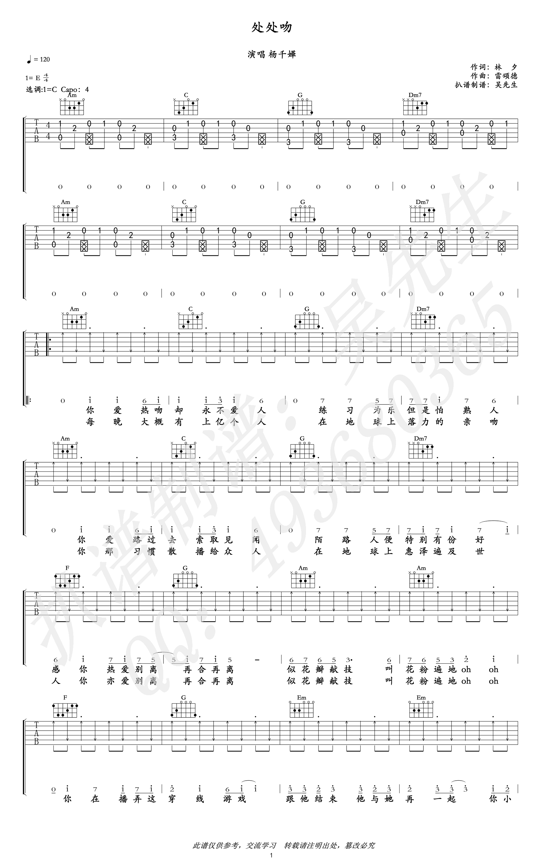 曲谱介绍: 《处处吻》吉他谱,杨千嬅演唱,一首最近被短视频平台翻唱重新火起来的粤语歌曲。处处吻六线谱,C调指法,Capo夹四品,三张高清弹唱图片谱,吴先生编配分享,上传收藏。 一首十多年前的经典老歌,唱出对爱情没有理由的勇敢和洒脱。轻快的节奏,流畅的词曲,尤其副歌部分感染力十足,让人跟着摇头晃脑。