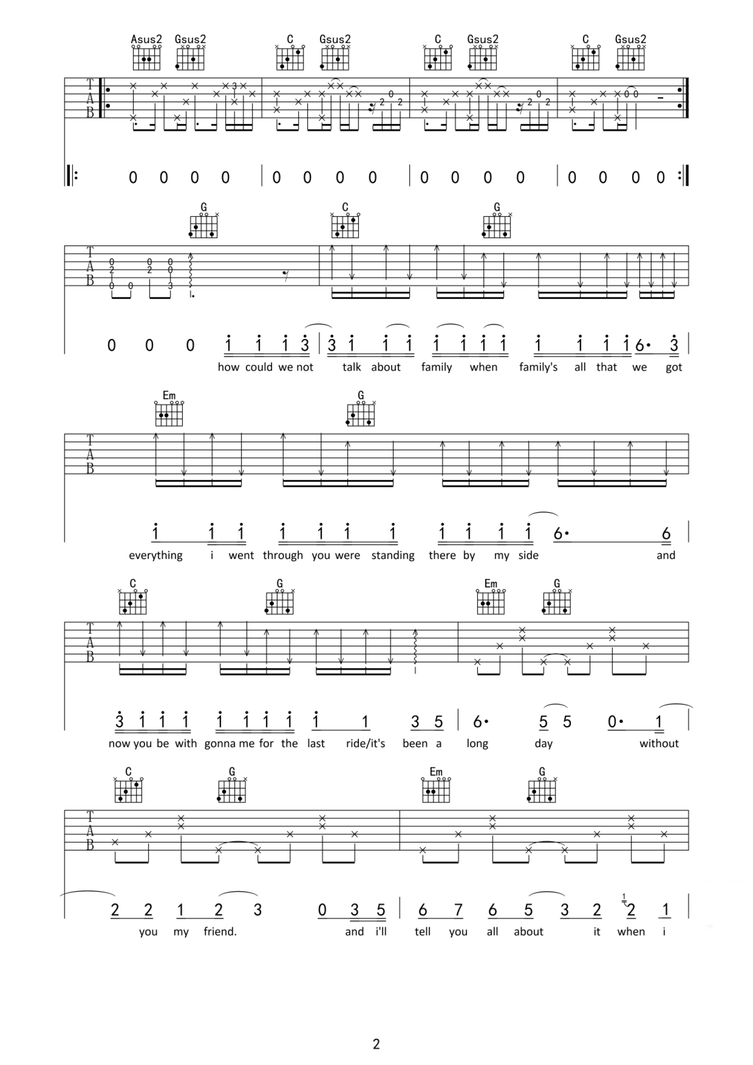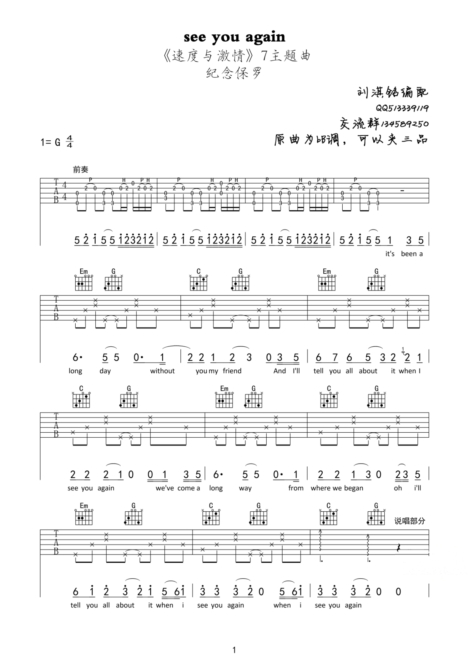 see you again吉他谱 - 速度与激情7片尾曲 - G调吉他弹唱谱