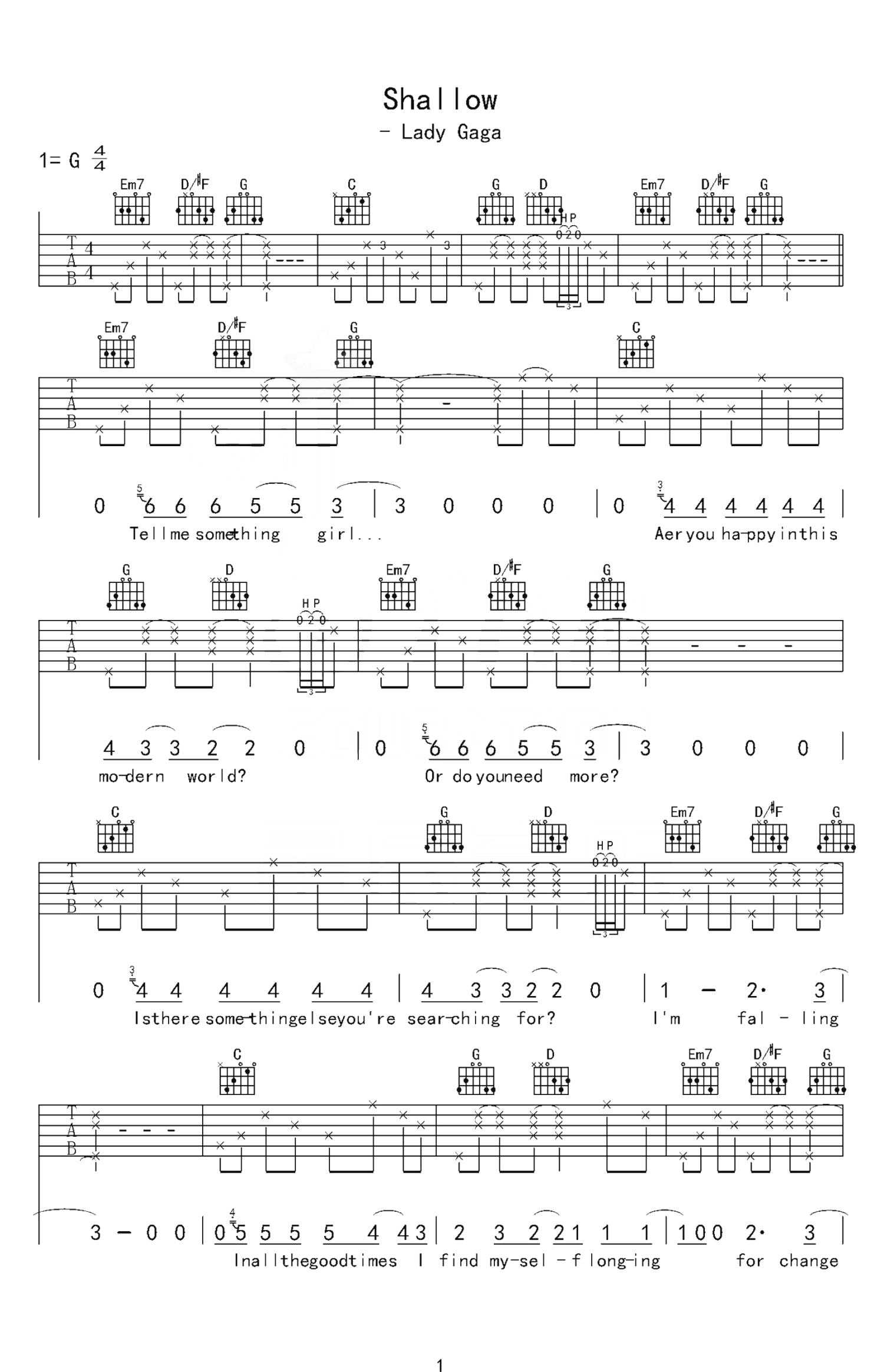 Shallow吉他谱 - Lady Gaga - G调吉他弹唱谱