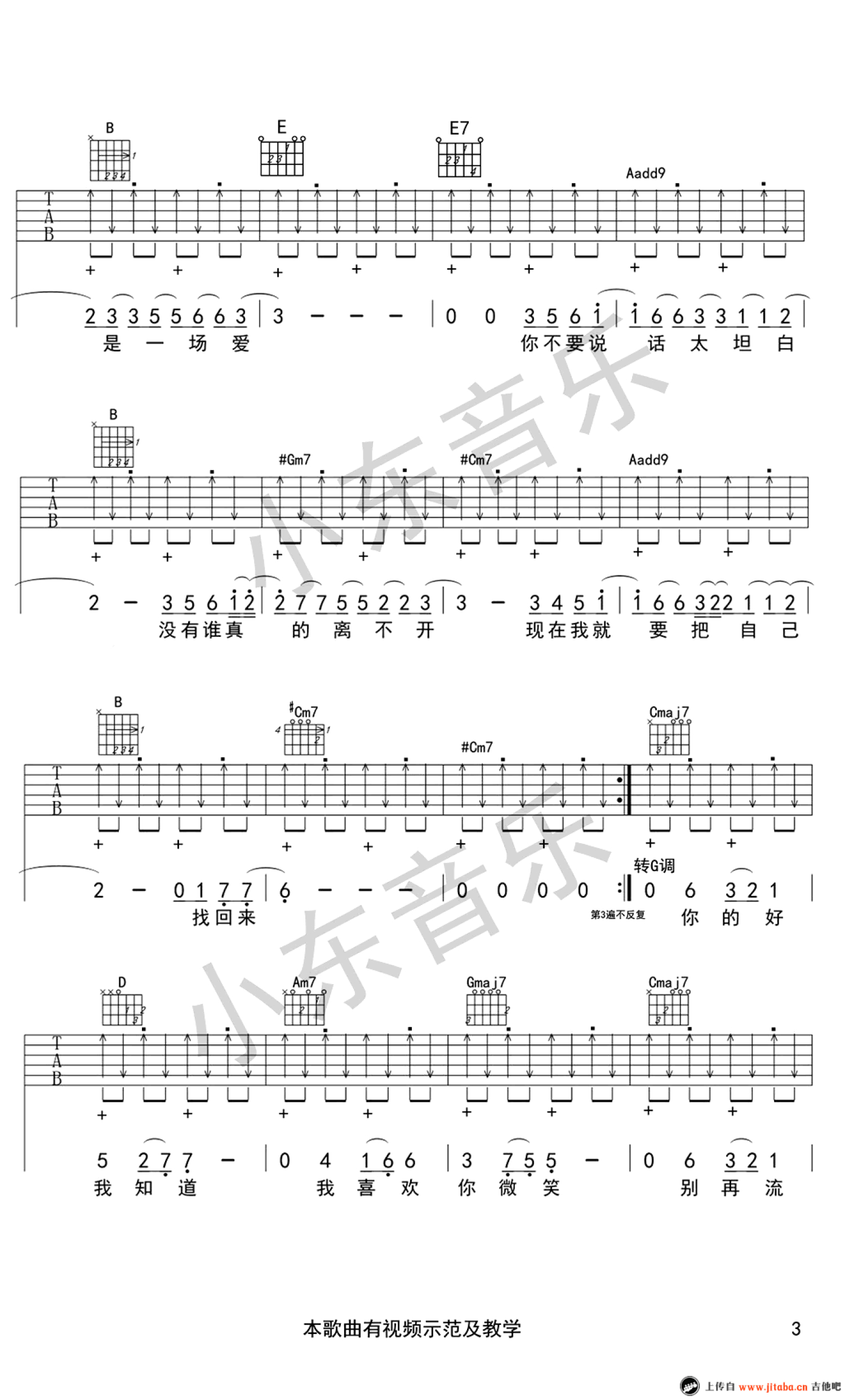 曲谱介绍: 太坦白六线谱,李荣浩演唱,太坦白吉他谱,E转G调,一首哀而不伤的情歌,由李荣浩词曲创作,收录在《模特》专辑中。陈奕迅在自己的巡回演唱会曾经翻唱了这首歌。陈奕迅也曾经翻唱李荣浩的《太坦白》,“你不要说话太坦白,搞的我心里好悲哀,再不怎么样,好歹也是一场爱”,很有味道。