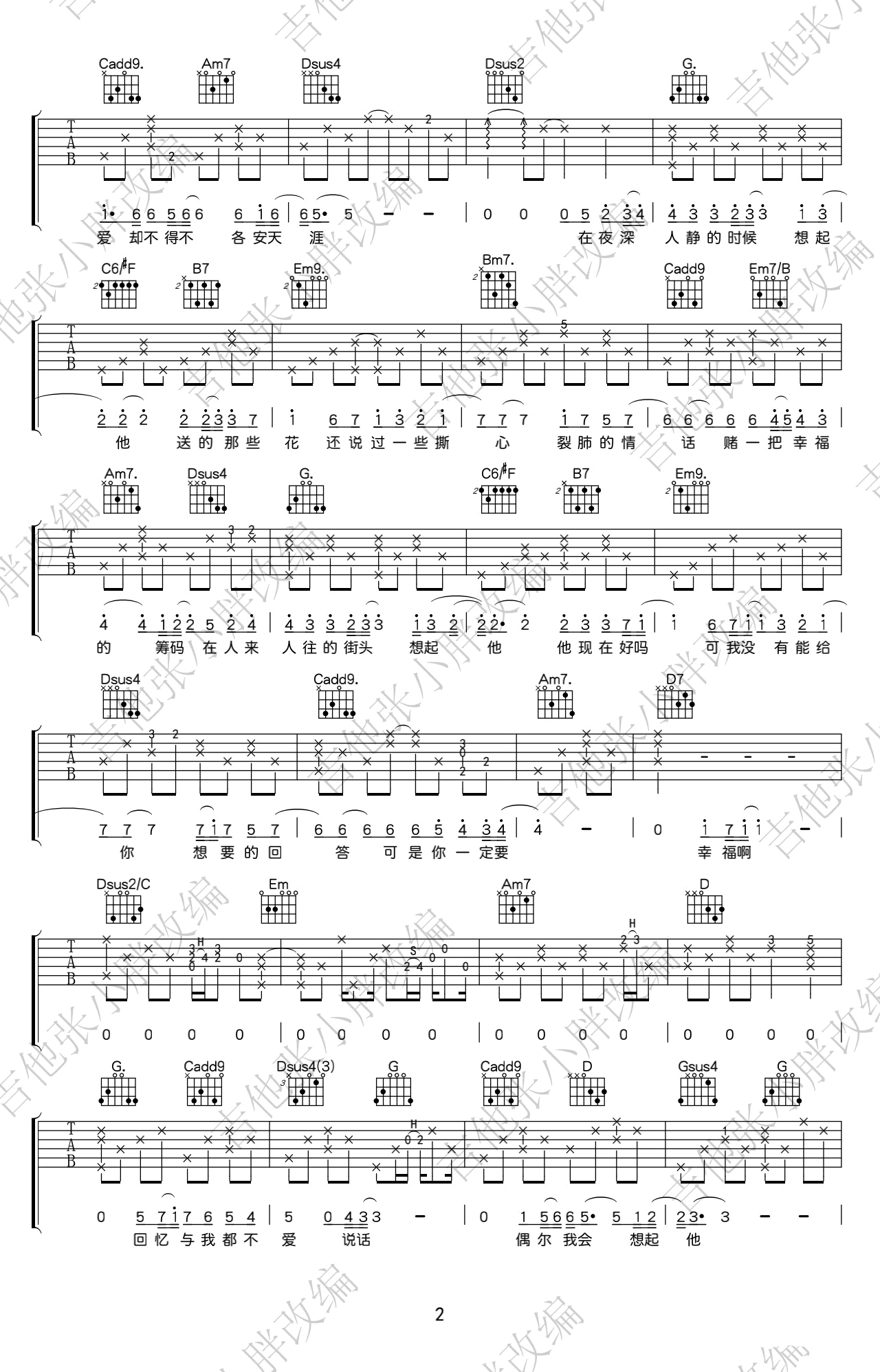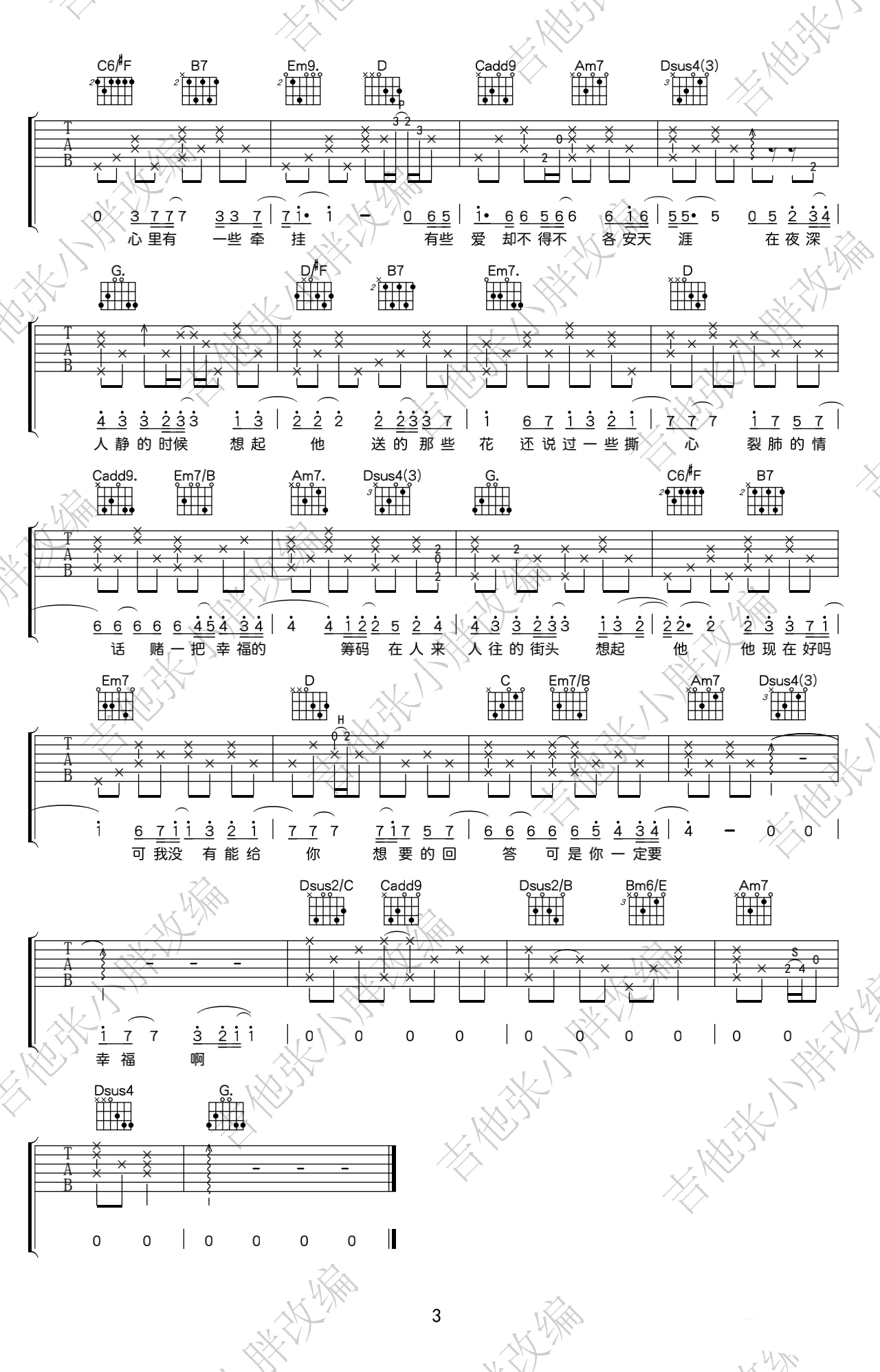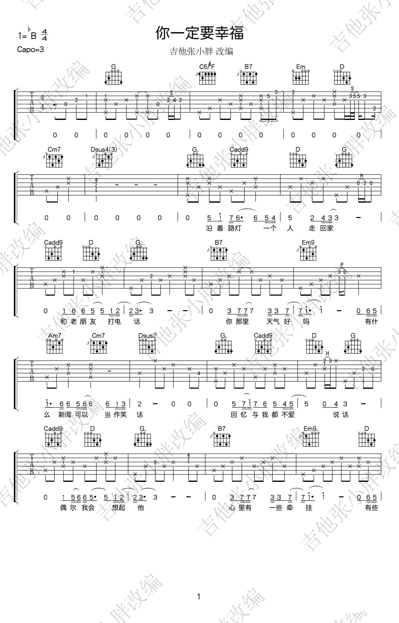 曲谱介绍: 《你一定要幸福》吉他谱,何洁原唱,男生弹唱版本,原调bB,选用变调夹夹三品,你一定要幸福六线谱,三张弹唱图片谱,吉他张小胖改编制谱,更新上传。 老师编配说明:一首很舒缓的情歌,我只听过简亦弘的版本。不过我这个版本也算是自己“瞎弹”的,还是跟之前一样,有很多我加的音是可以省略的,初学者可以用简单的指法按照和弦来弹。