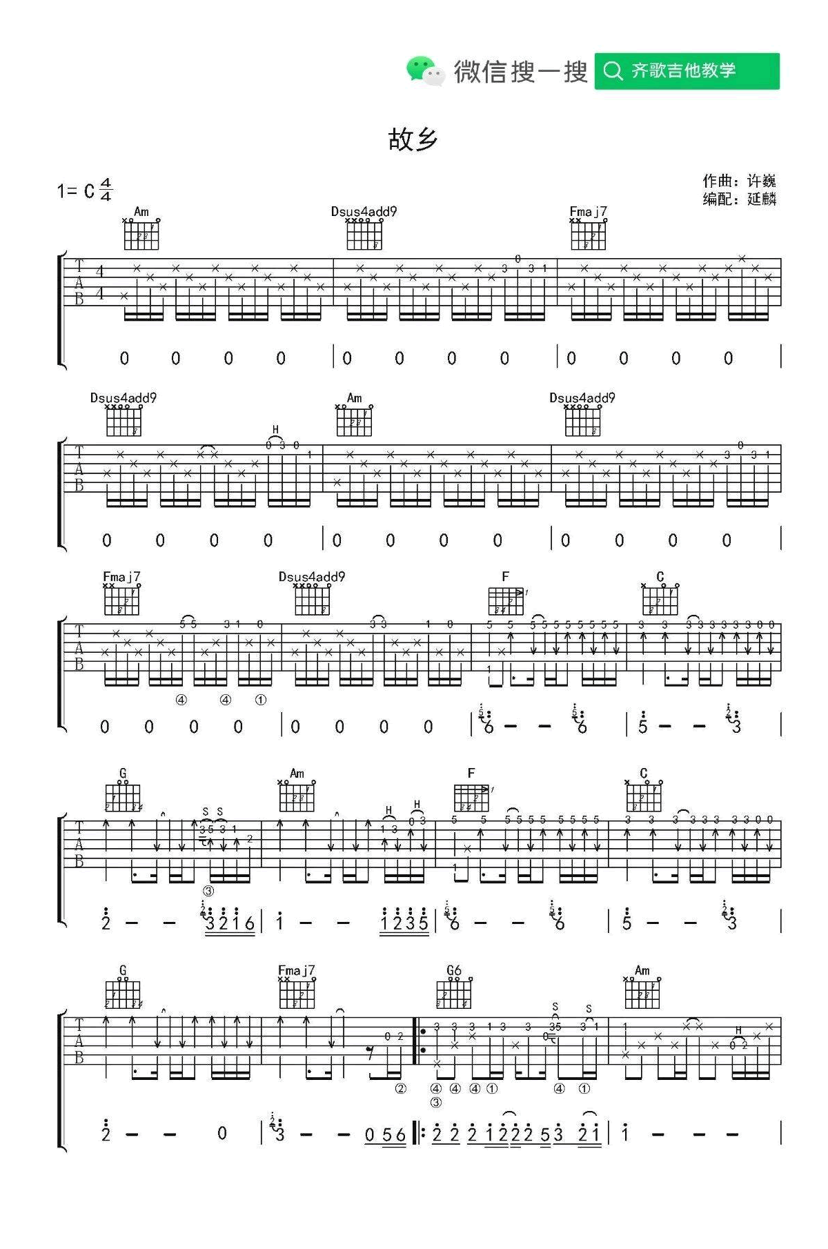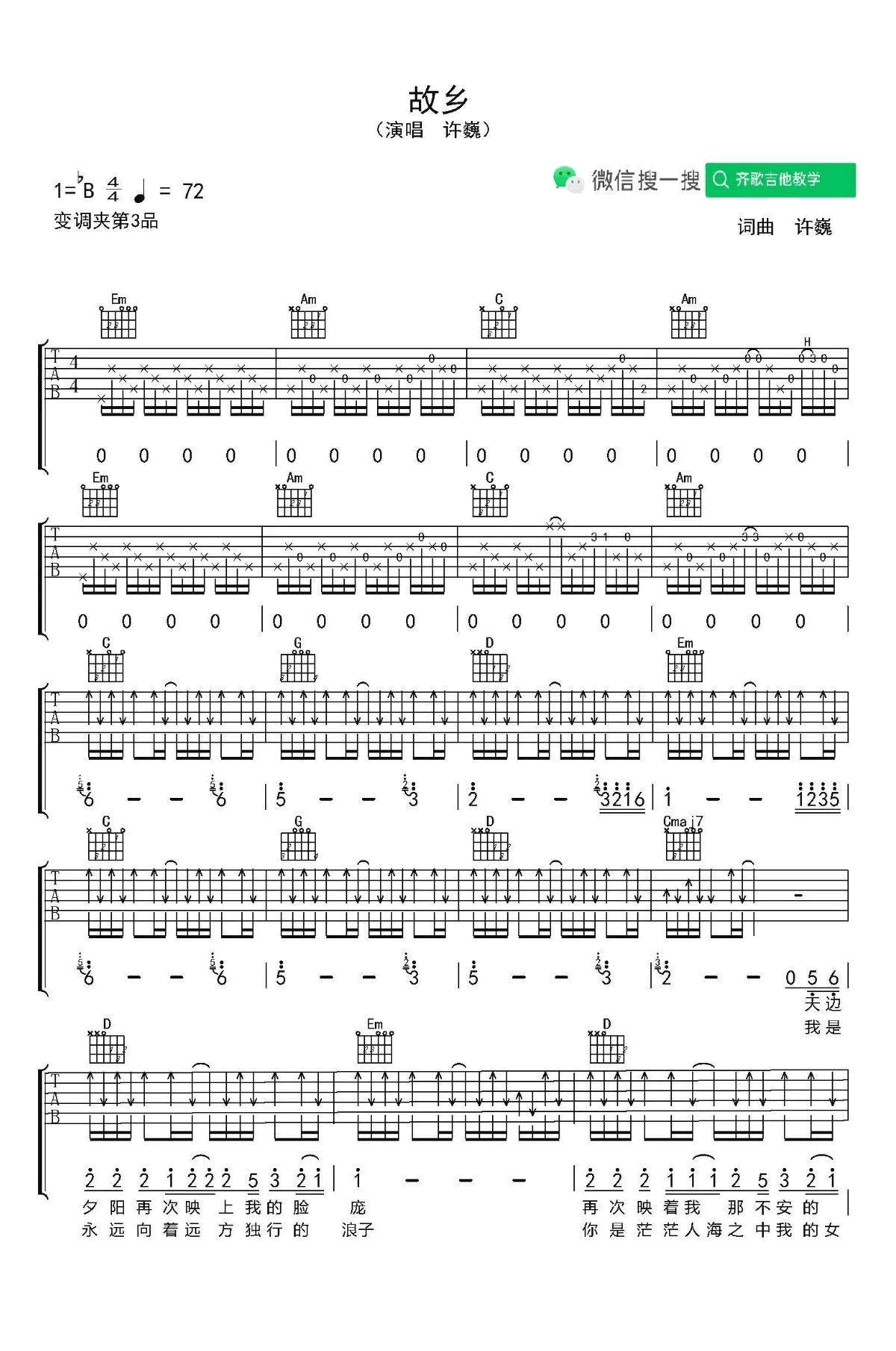 曲谱介绍: 《故乡》指弹吉他谱和弹唱谱,许巍的一首经典代表作品,故乡吉他独奏谱+吉他弹唱六线谱,齐歌吉他编配出品,上传更新。 延麟老师编配演奏说明:下面这个视频是指弹版的《故乡》,前奏部分,快速换把后加扫弦不太好处理,后来已经改了(谱子上就是已经修改过的),我弹的都是把这里改成拨弦了,就是将1弦5品和六弦1品一起弹,而不是扫弦,这样会连贯得更好一些。