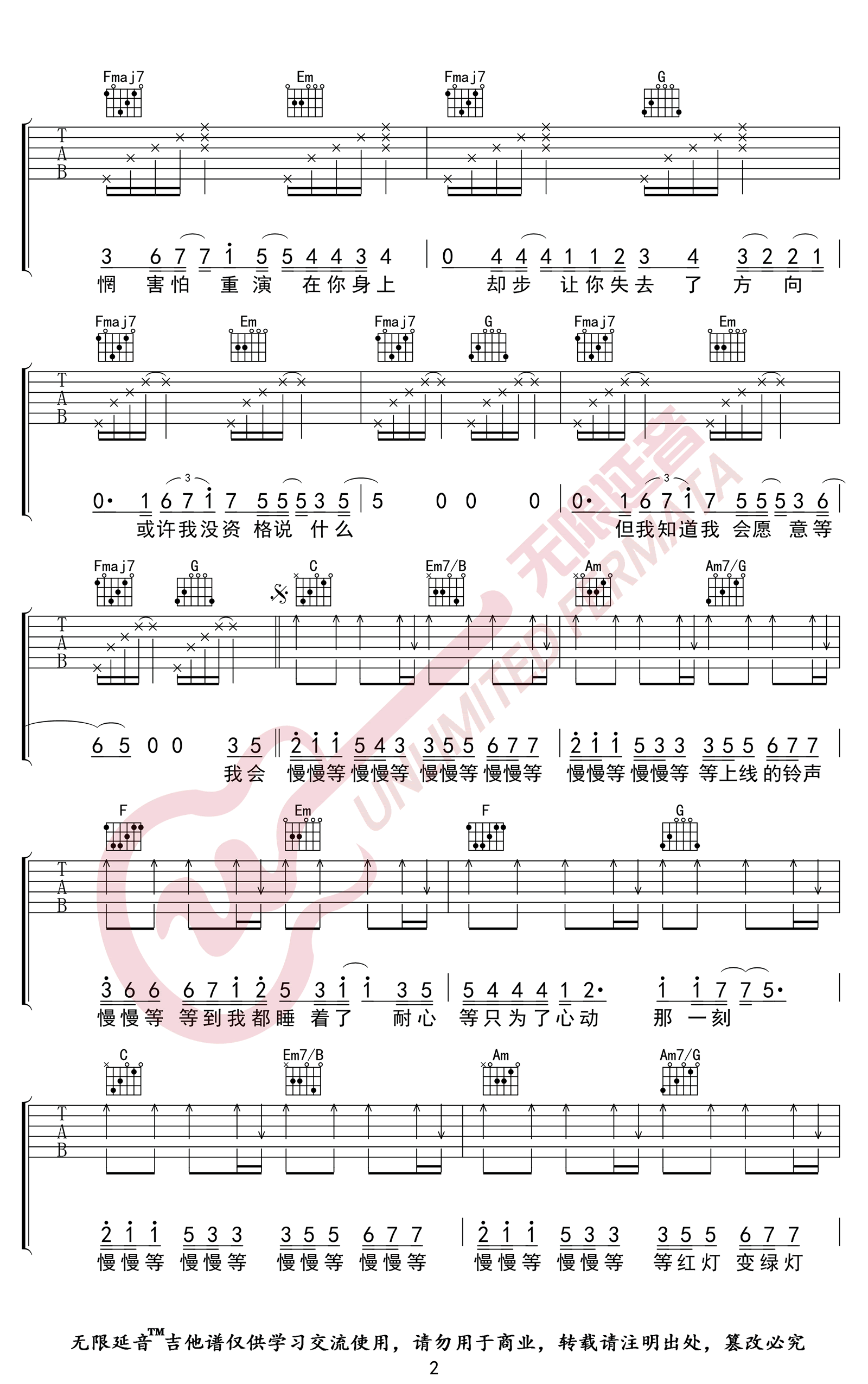 曲谱介绍: 《慢慢等》吉他谱,韦礼安演唱,原调A,变调夹夹第二品,选用G调指法。慢慢等六线谱,三张弹唱图片谱。无限延音编配,整理分享。