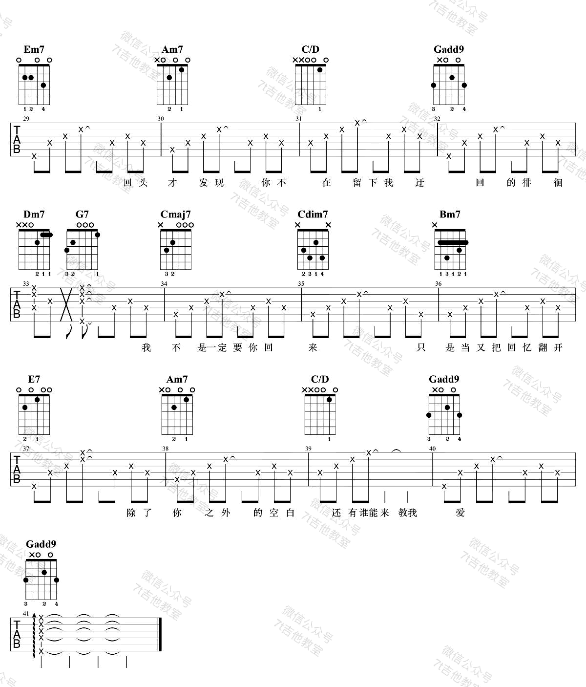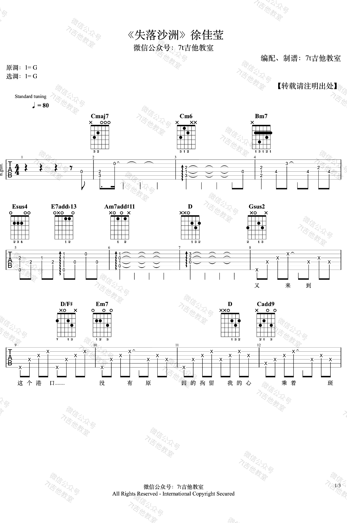 曲谱介绍: 失落沙洲吉他谱,徐佳莹演唱,这首歌的原调是G大调,用的也是G大调的指法来编配,视频里是标准音调弦,变调夹夹在第2品,适合音域较低的男生~想唱原调的童鞋不夹变调夹就可以哦!女生如果觉得原调太高,可以降半音调弦~ 7T吉他教室编配制谱,整理上传。 右手节奏型方面大家可以自由发挥,因为有很多种节奏型都能把同一首歌弹得很好听,不必完全按照谱子上的来弹哦!尤其是初学者如果觉得谱子的节奏型太难,完全可以用最基础的节奏型来代替~