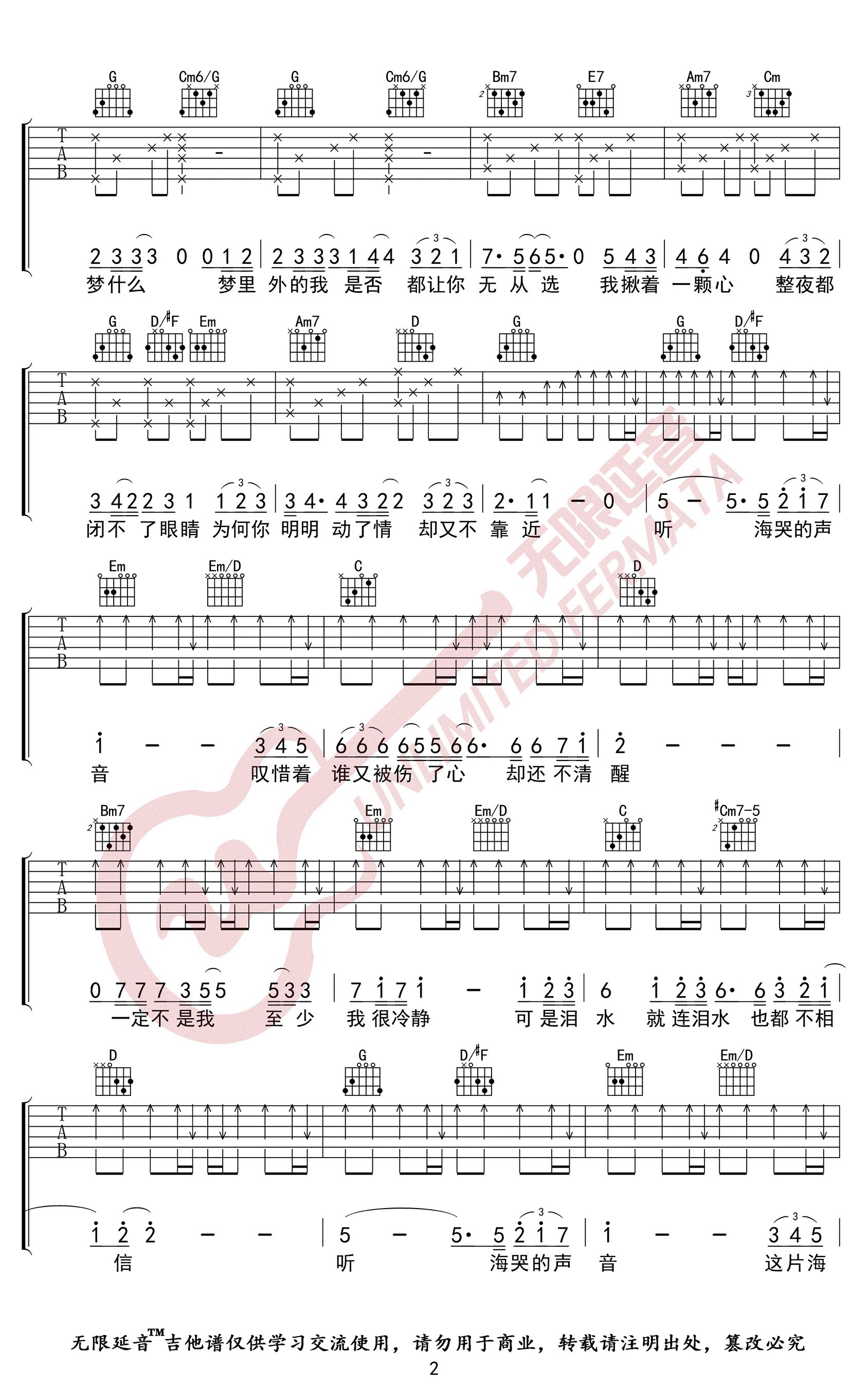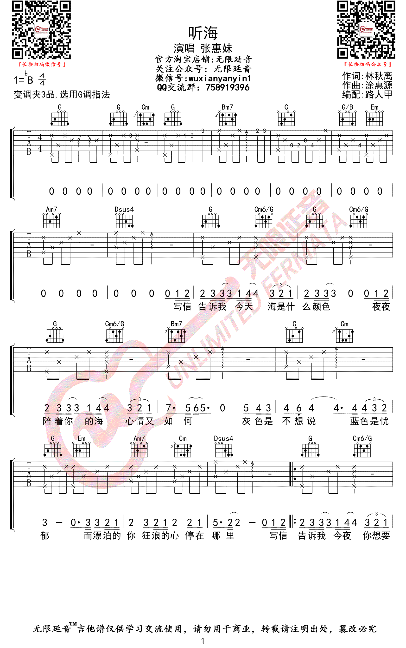 曲谱介绍: 听海吉他谱,张惠妹演唱的一首给人无限共鸣感动的经典代表歌曲。听海六线谱,原调降B,变调夹夹第三品,选用G调指法,三张高清弹唱图片谱,无限延音编配出品,更新分享。
