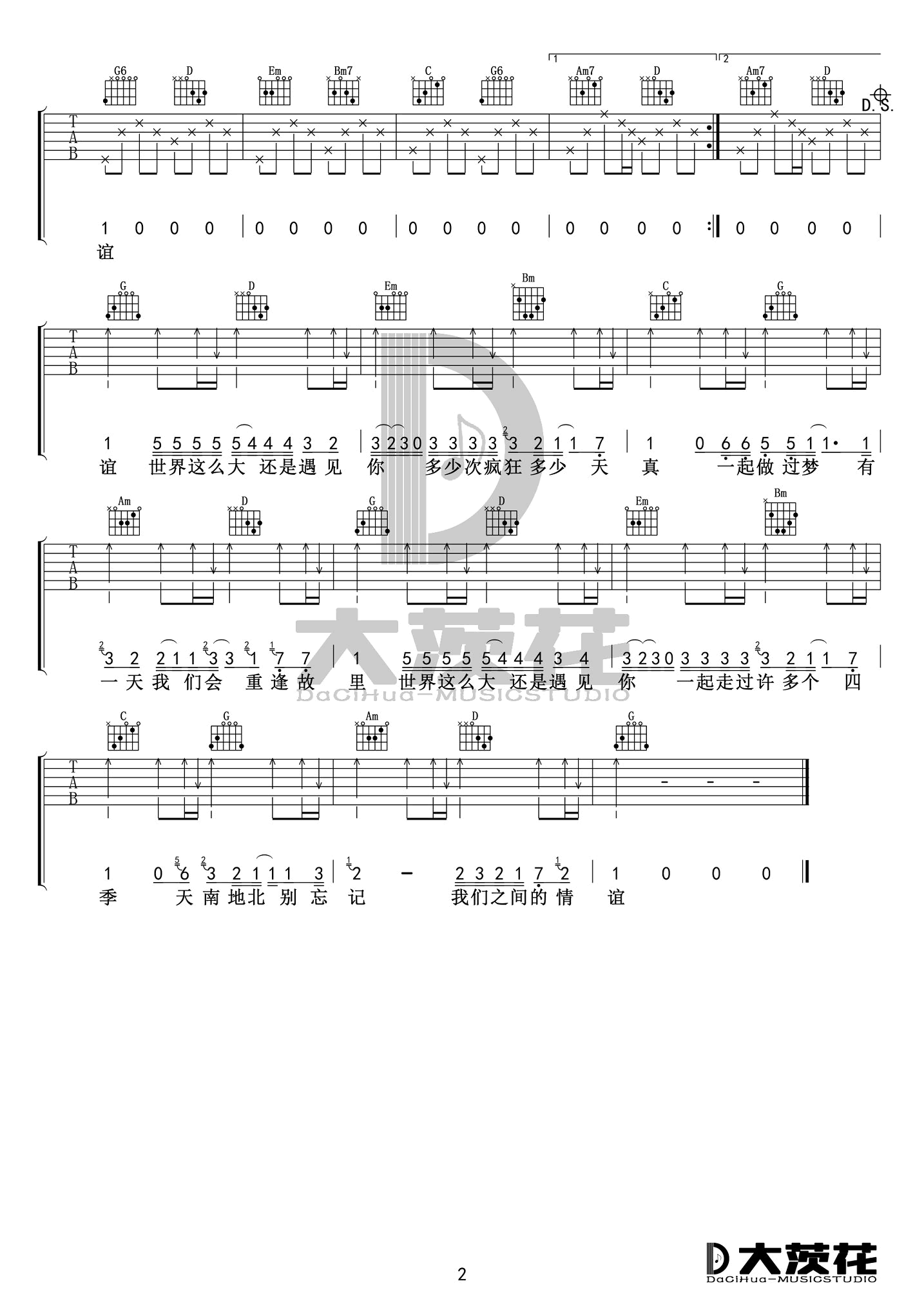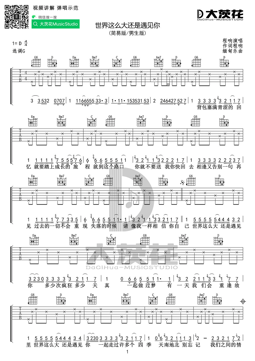 曲谱介绍: 《世界这么大还是遇见你》吉他谱,程响演唱,改编自网络热门歌曲,缅甸歌曲《清新的小女孩》中文版,《世界这么大还是遇见你》六线谱,原调D,选调G,男生版简易版,大茨花音乐工作室编配出品,上传分享。 缅甸神曲中文版,天天刷短视频都会不经意听到,又一首洗脑神曲。人生旅途,每个阶段都会遇到不同的人,感谢你们的陪伴,未来加油!