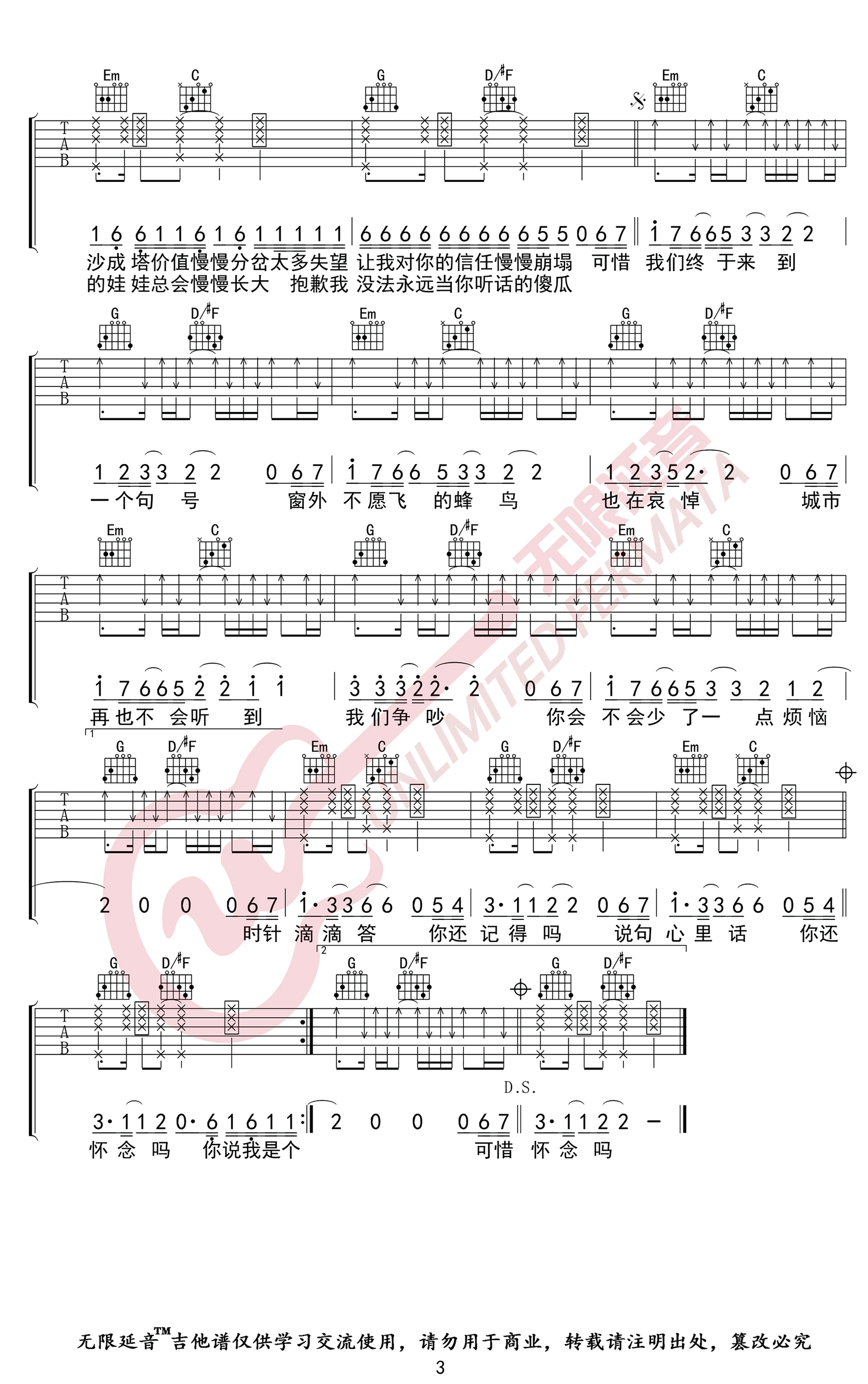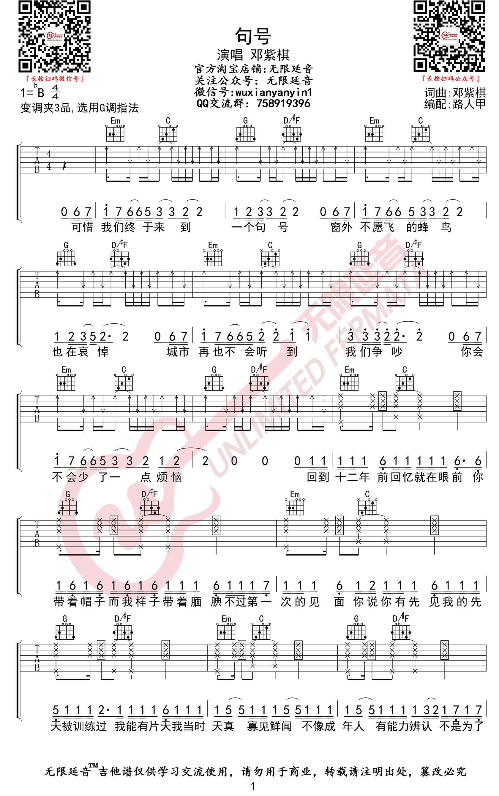 曲谱介绍: 《句号》吉他谱,邓紫棋演唱,降B调,选用G调指法,变调夹夹第三品。句号六线谱,共三张弹唱图片谱。无限延音编配分享,整理上传。 这首歌更像是是邓紫棋给前经纪公司写了一封“分手信”。意味着自己将要告别过去,迎接新的开始。这首「句号」也是邓紫棋为过去画上句号,浴火重生,迎接全新未来的一首歌,舒缓的旋律+真情实感的歌词,感染力简直MAX~