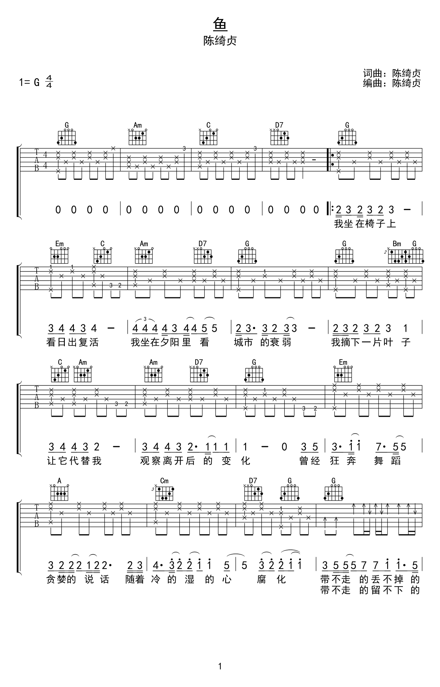 曲谱介绍: 《鱼》吉他谱,陈绮贞09年的一首歌曲,鱼六线谱,G调指法弹唱,三张高清图片谱,吉他专家编配制谱,更新分享。 这首歌代表的是一种无论何时都压不垮的希望,陈绮贞细腻的声线下藏着一股让人心酸的洒脱。歌曲中的那条在出海口犹豫挣扎的鱼,它憧憬身后辽阔的大海,却仍毫不保留地深爱着溯流而来的这个世界。在听这首歌的时候是否想起一些人,又或许想起一段往事呢?