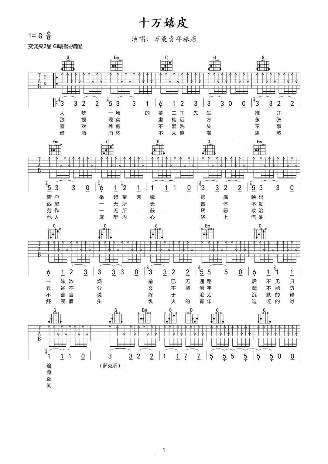 曲谱介绍: 吉他谱介绍:十万嬉皮吉他谱,万能青年旅店演唱的一首歌曲,6/8拍的节奏,这首歌曲的原调为A调,这里曲谱采用了G调指法进行编配,演唱时夹变调夹2品可回到原调,也可根据个人实际嗓音情况选择。曲谱由琴谱网更新上传,共2张高清图片弹唱吉他谱例,曲谱来源于网络转载,编配制谱者暂不详。