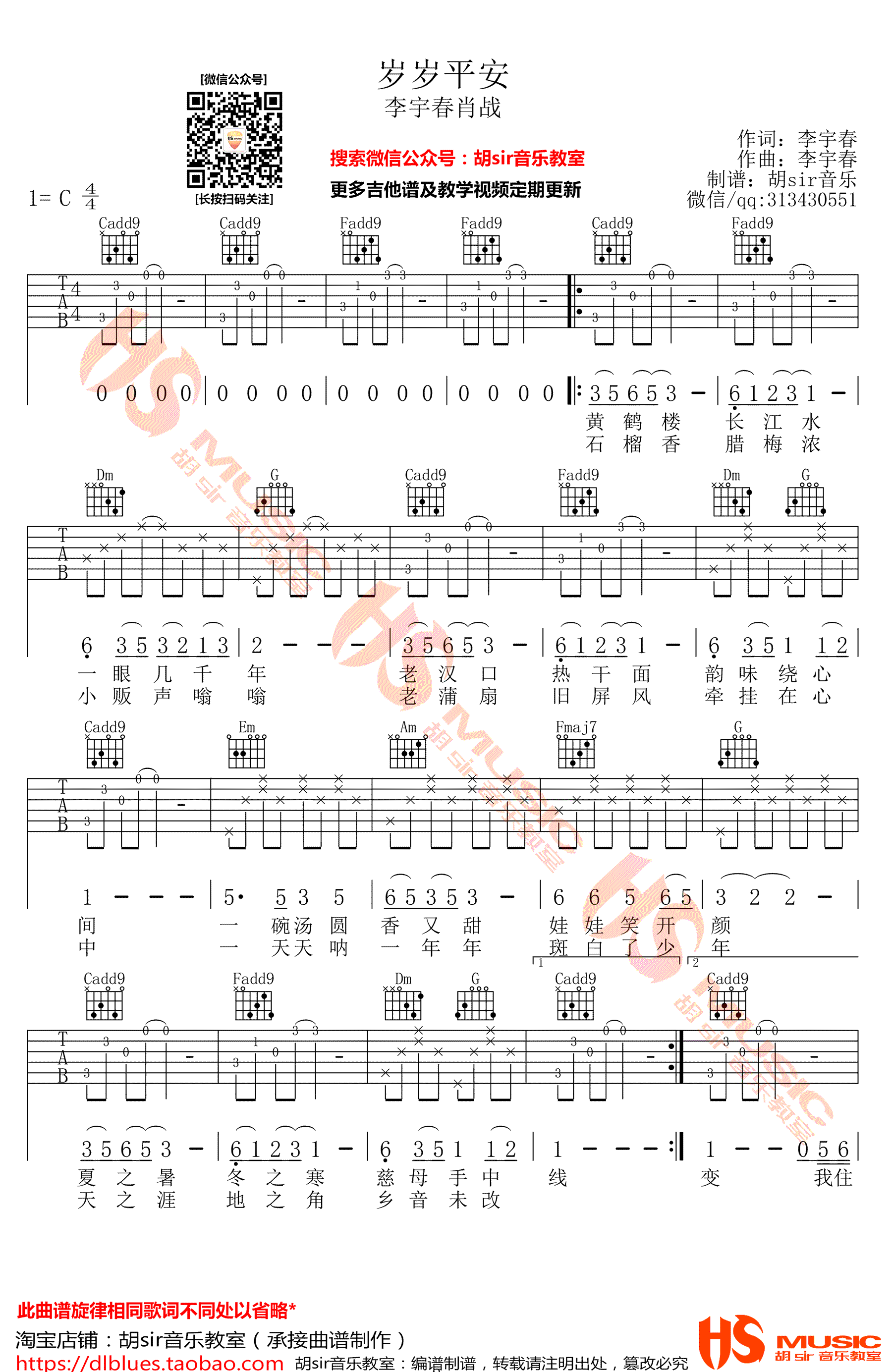 曲谱介绍: 《岁岁平安》吉他谱,李宇春肖战演唱,在这个特殊的日子里,一首公益歌曲《岁岁平安》,为武汉祈福为中国加油!岁岁平安六线谱,C调指法,两张弹唱图片谱。胡sir音乐编配,更新上传。 一首暖心的正能量单曲,以柔和诗意的曲风为亲人、为疫区人民、为战疫英雄祈福平安。春暖艳阳天,疫情面前我们心连心在一起!愿亲人们一切安好,让我们携手共渡难关。