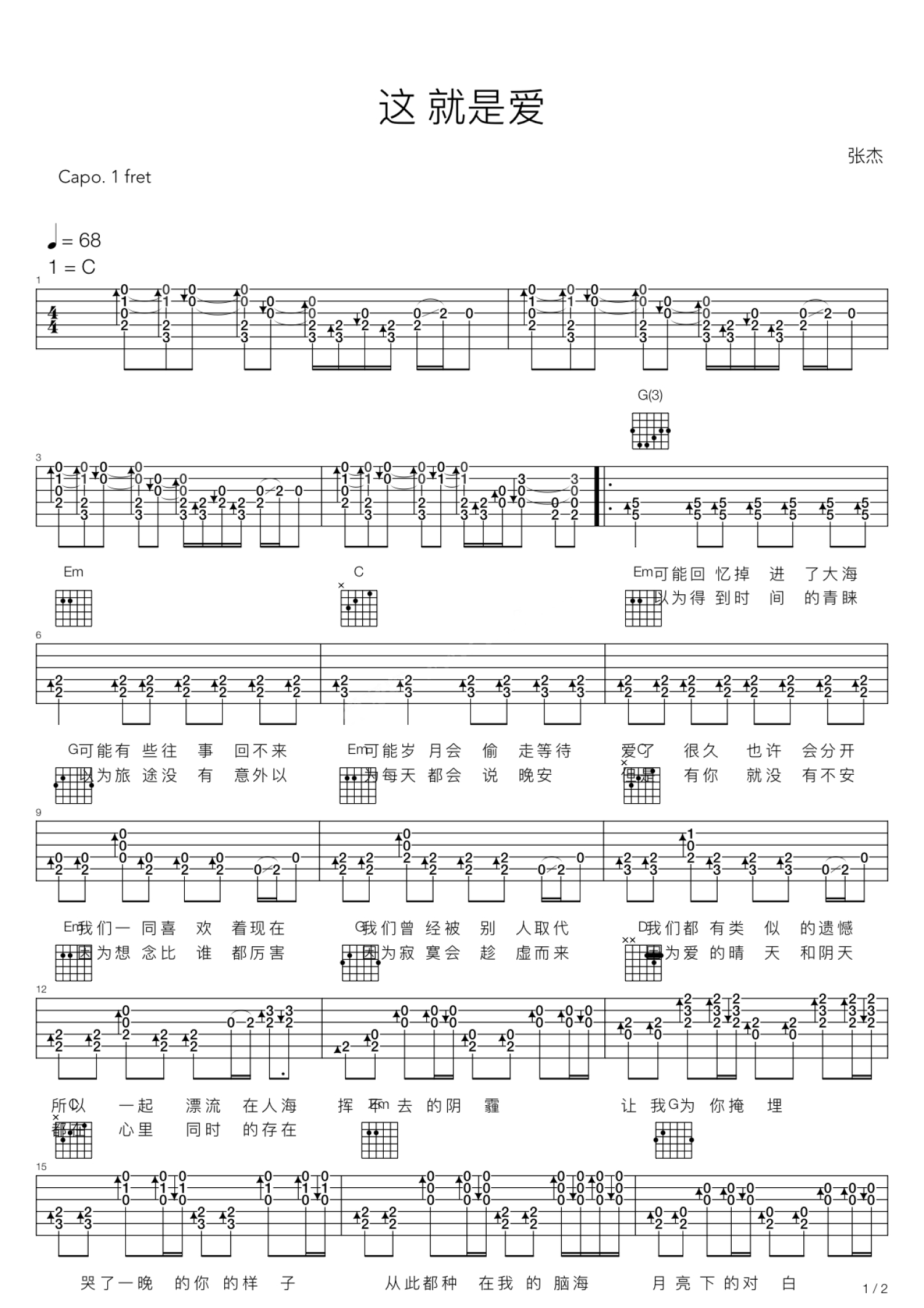 曲谱介绍: 张杰《这就是爱》吉他谱_C调吉他弹唱谱