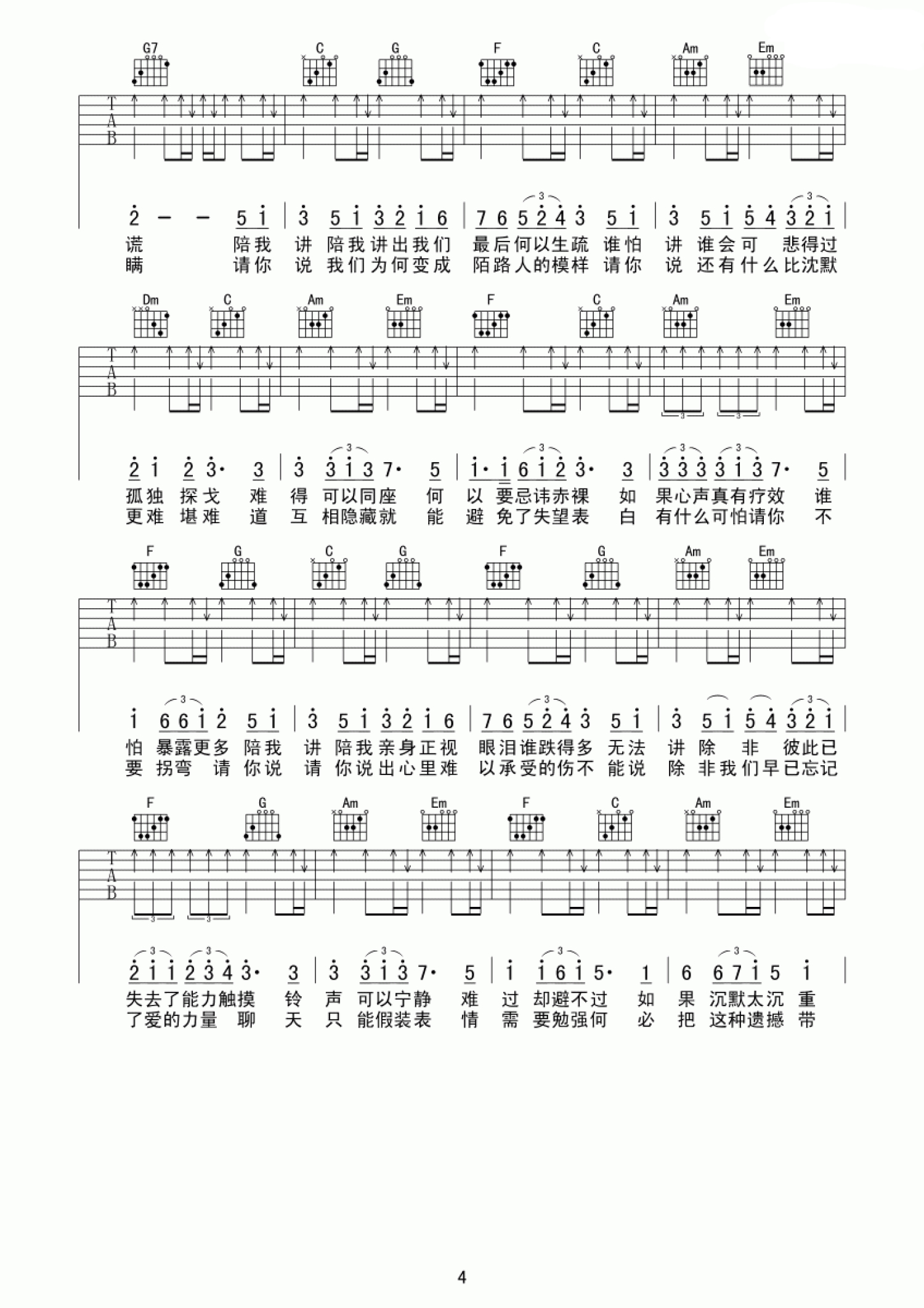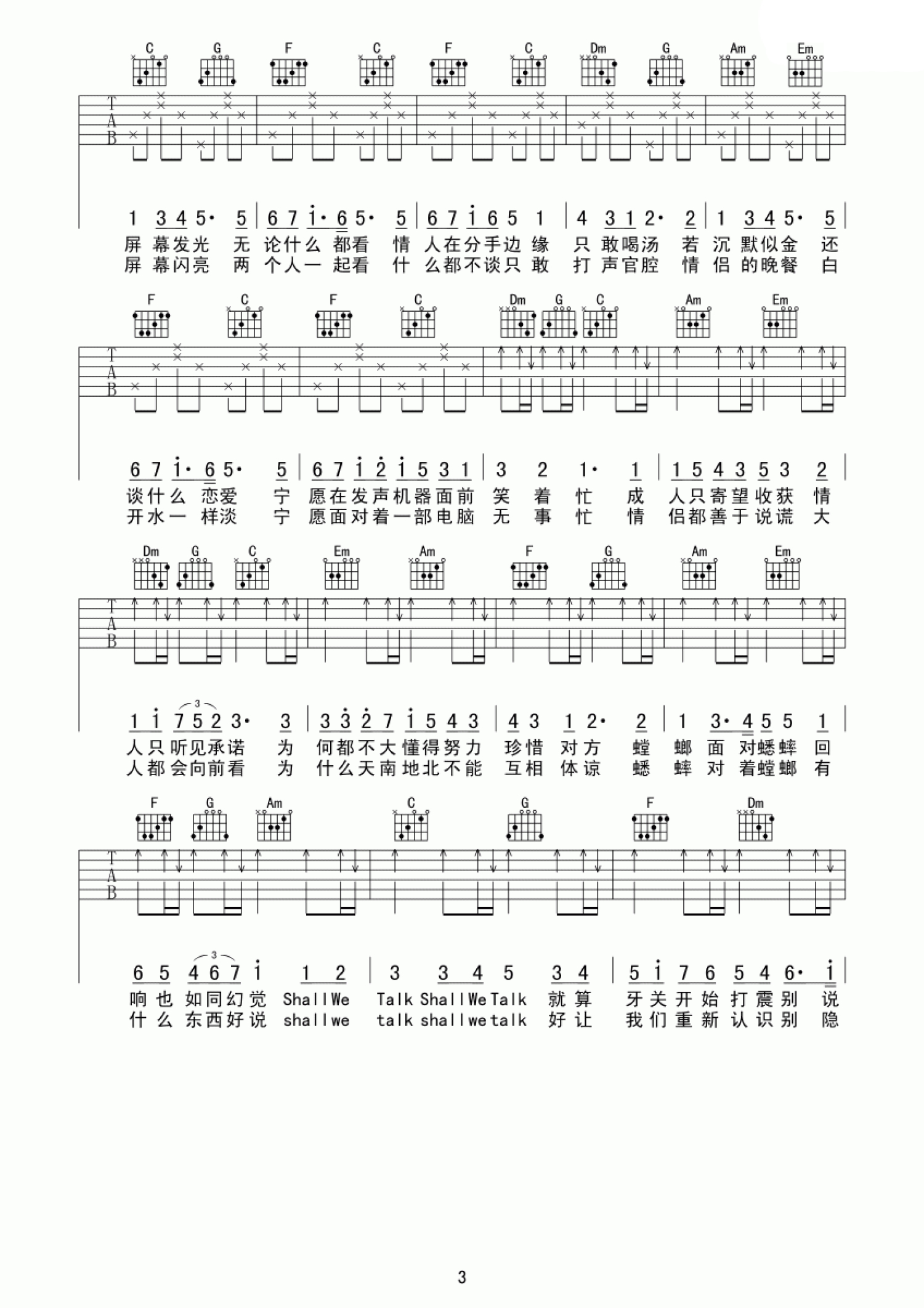 曲谱介绍: ShallWeTalk吉他谱陈奕迅ShallWeTalk吉他谱,C调指法编配,国语和粤语歌词同步呈现。ShallWeTalk是一首慢歌,曲调动听优美,林夕的填词歌词意义深远,描述了亲子之间日渐疏离和淡漠的关系,回想曾经年幼手牵手一起上学的时光,如今为何走到这般情形,ShallWeTalk我们可以谈谈吗?
