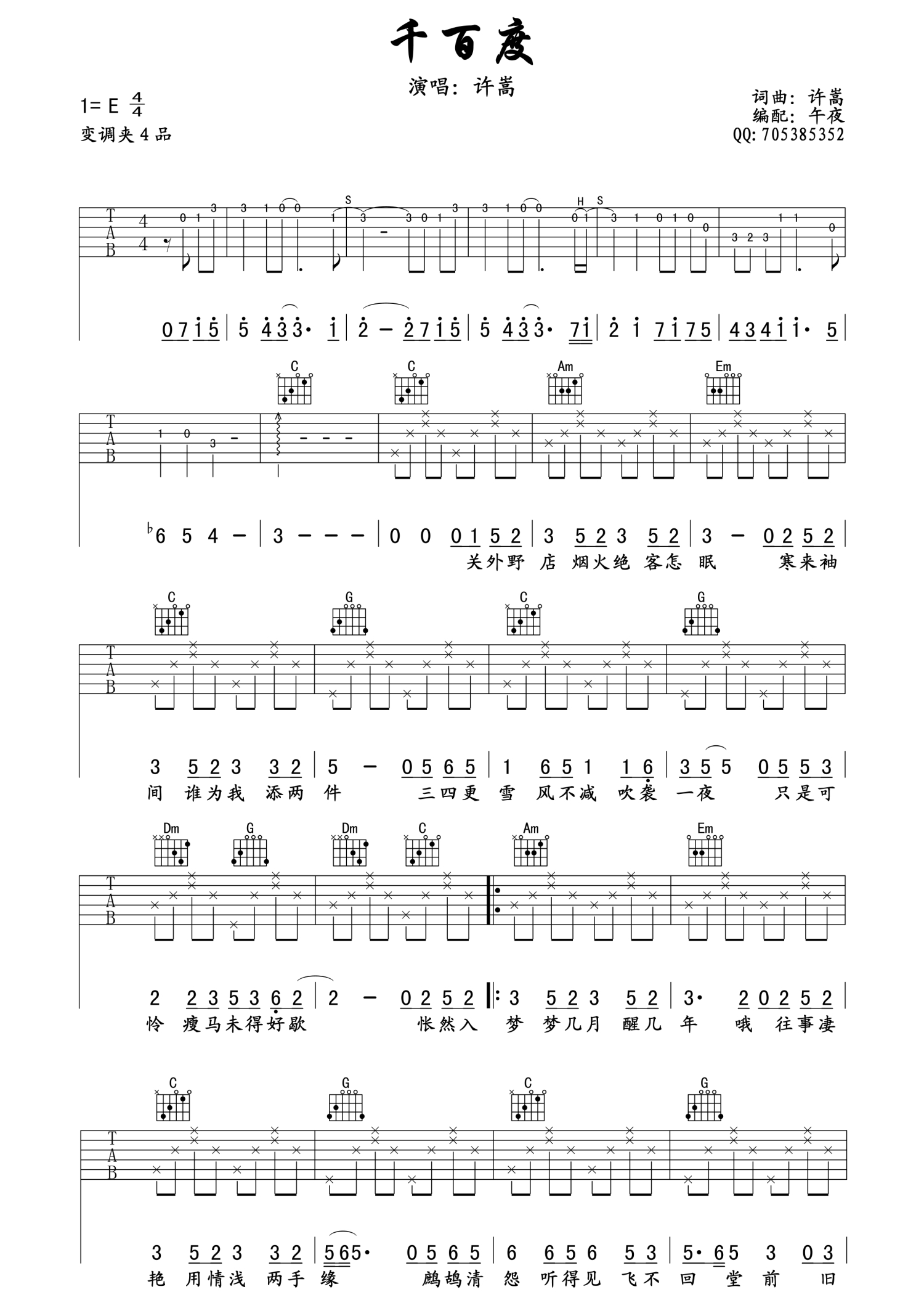 千百度吉他谱 - 许嵩 - E调吉他弹唱谱