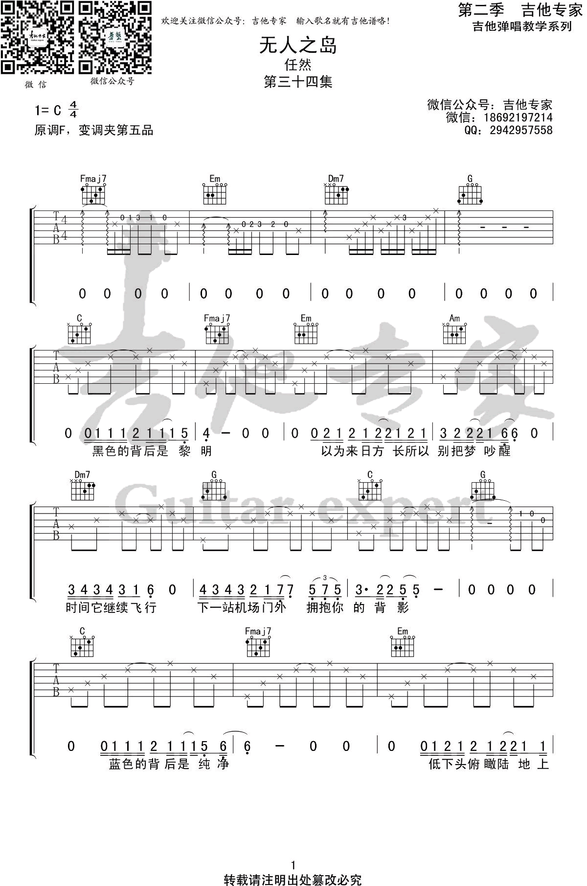 曲谱介绍: 任然《无人之岛》吉他谱,原调F,变调夹夹五品,选用C调指法。男声不加变调夹应该比较舒服。无人之岛六线谱,三张弹唱图片谱,吉他专家编配,整理更新上传。
