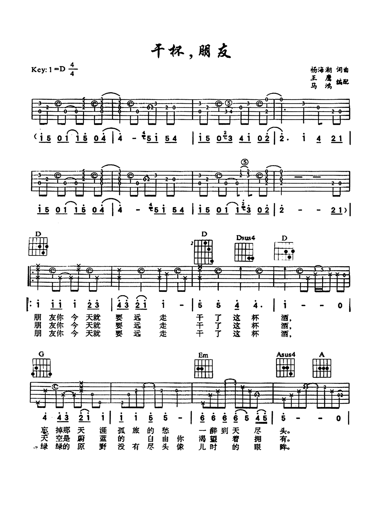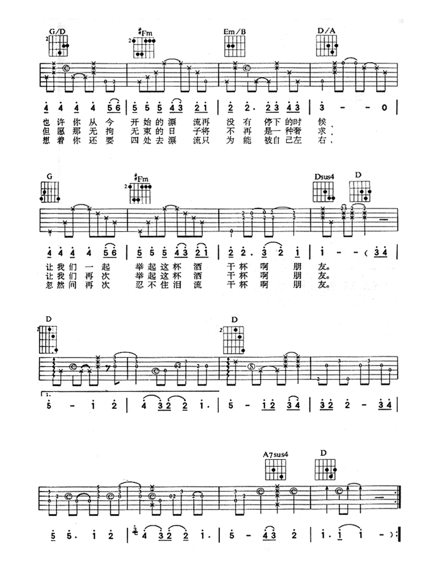 干杯朋友吉他谱 - 田震 - D调吉他弹唱谱
