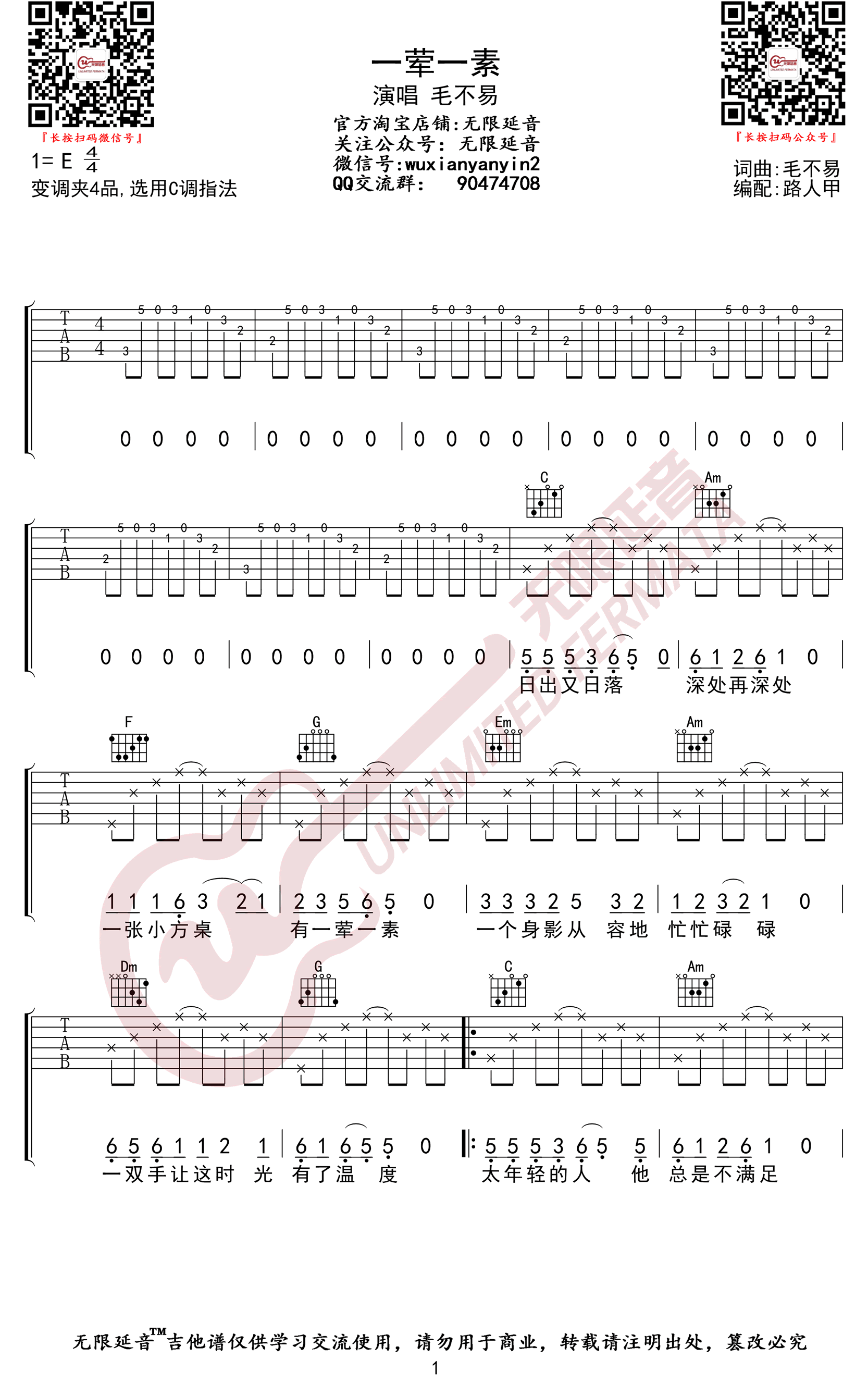 曲谱介绍: 一荤一素吉他谱,毛不易演唱的一首抒情歌曲,选用C调指法,变调夹夹第四品为原调E。一荤一素吉他六线谱,三张弹唱高清图片谱。感谢无限延音编配,吉他谱上传分享。 这首写给已故母亲的歌,唱哭了太多人,低缓的声音轻轻诉说,没有华丽辞藻,没有过分渲染,一荤一素的平淡,背后却是母爱的琐碎深沉,让无数人潸然泪下。